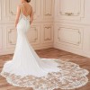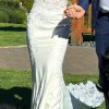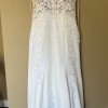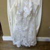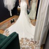 Romantic ivory wedding dress with sheer floral lace on the bodice which extends to the hips at the sides and detailed flower appliqués. Intricate beading and sequins throughout the dress for a touch of sparkle with movement. Sweetheart neckline with crossing straps in the back. Zipper at the back hidden by line of buttons that extend to the floor. Floral lace train in a laser-cut flower petal shape. Crepe fabric allows for easy movement while the fit and flare cut gives you that hourglass shape!