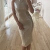 The Sarah Seven Espresso is a sexy midi dress perfect to add to your closet. The halter neckline adds a touch of modesty while the gown contours your body. The flat clear sequin on a nude backing is a sophisticated choice and yet glimmers in the light.