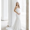 Elegant Rosewood has a strapless, ruched, corseted bodice with Fit to flare style dress draped detail with train.
