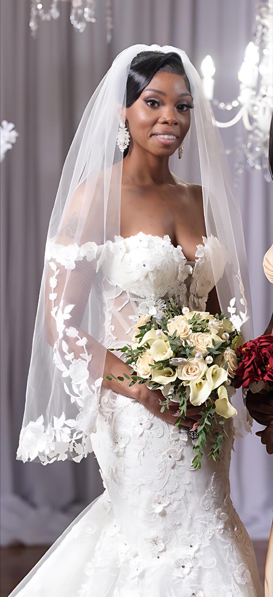 • Trumpet-style tulle skirt with floral appliqués and sequin underlay for a subtle sparkle