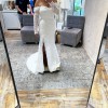 Allover lace fabric, Long sleeves, Off-the-shoulder neckline, Side slit, Chapel length train, Invisible back zipper.