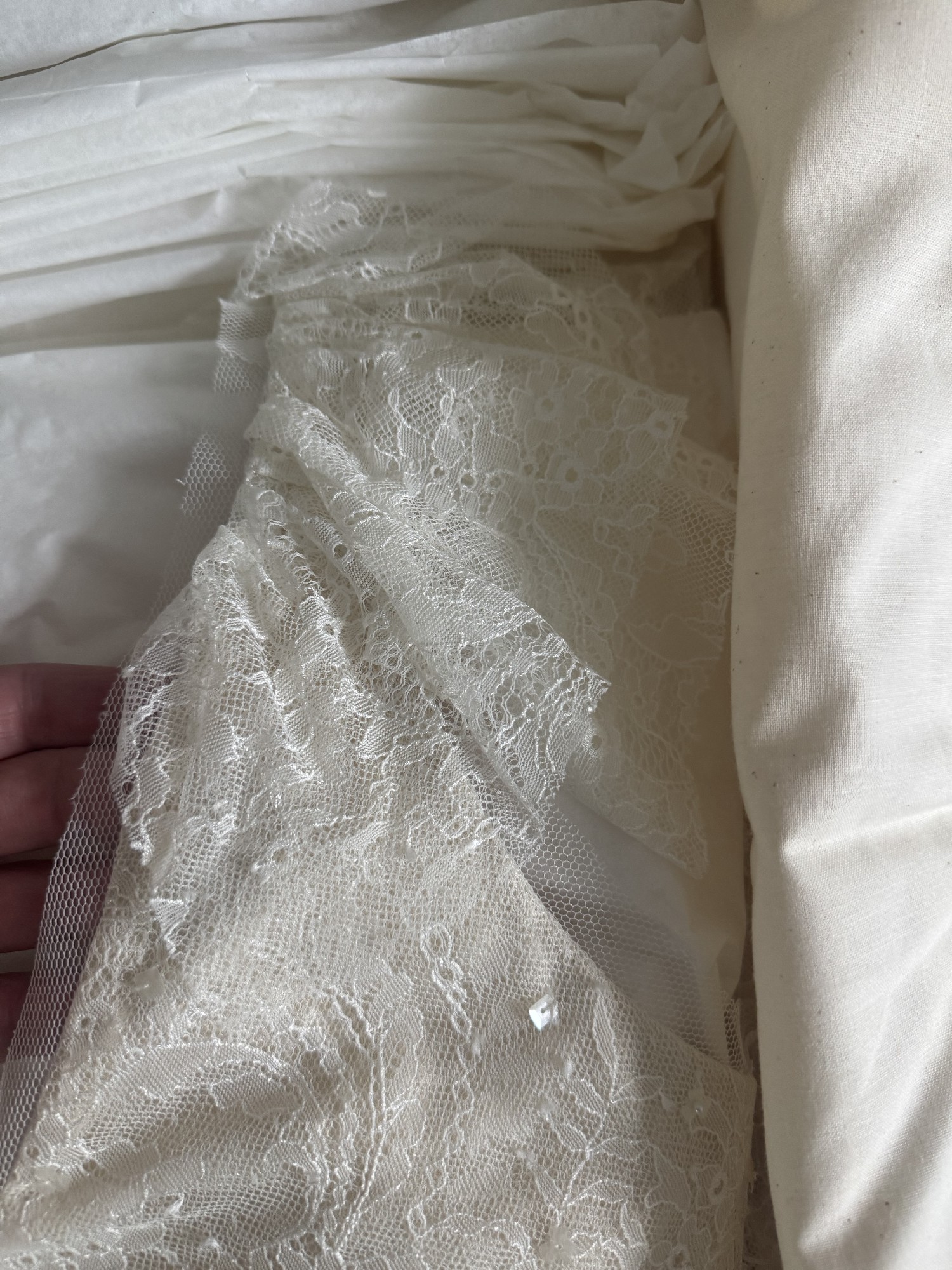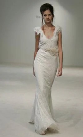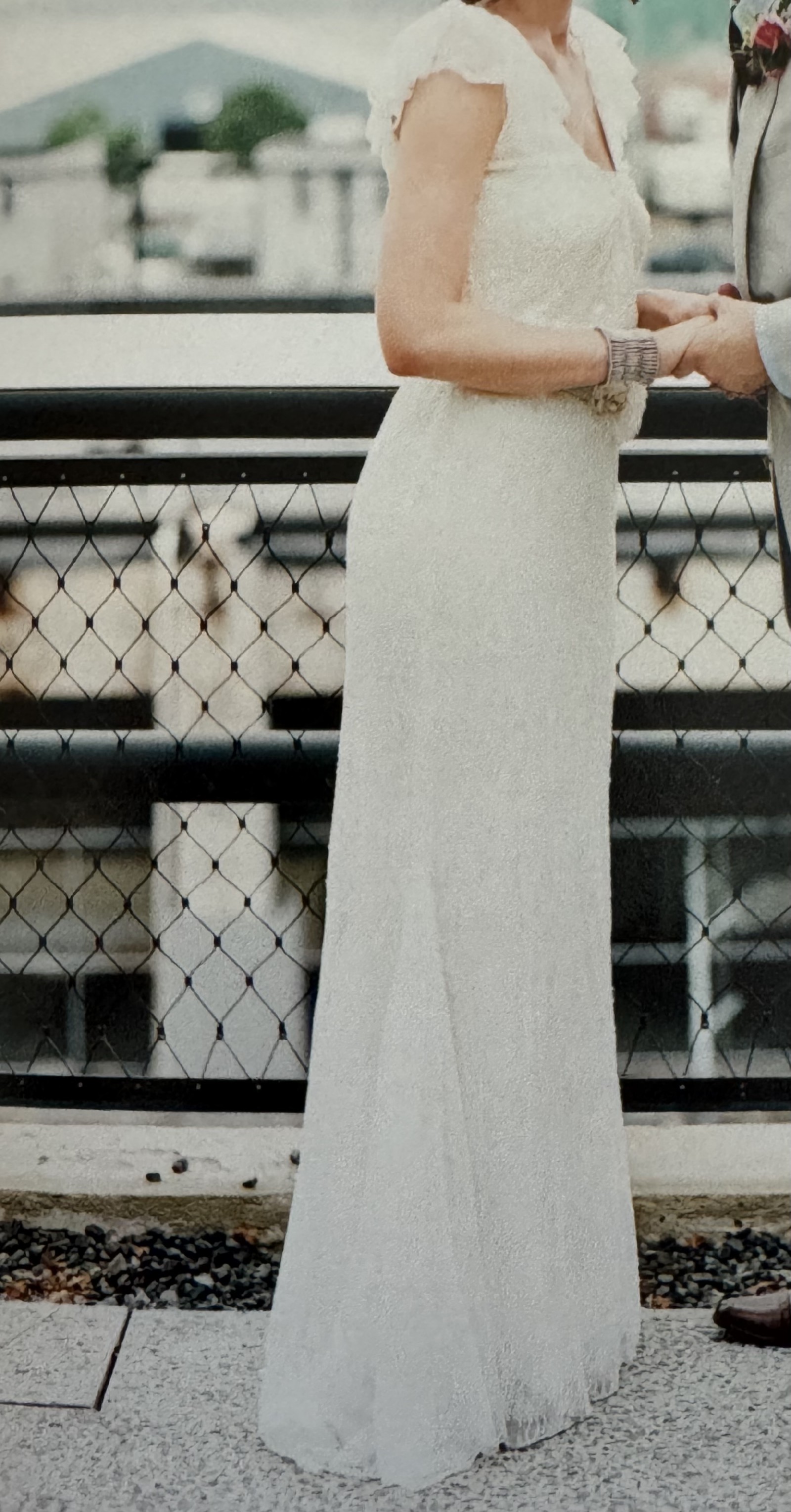 Ivory chantilly lace vintage sheath w/scoop neckline. Tiny paillettes sewn throughout catch the light to create a subtle shimmer.