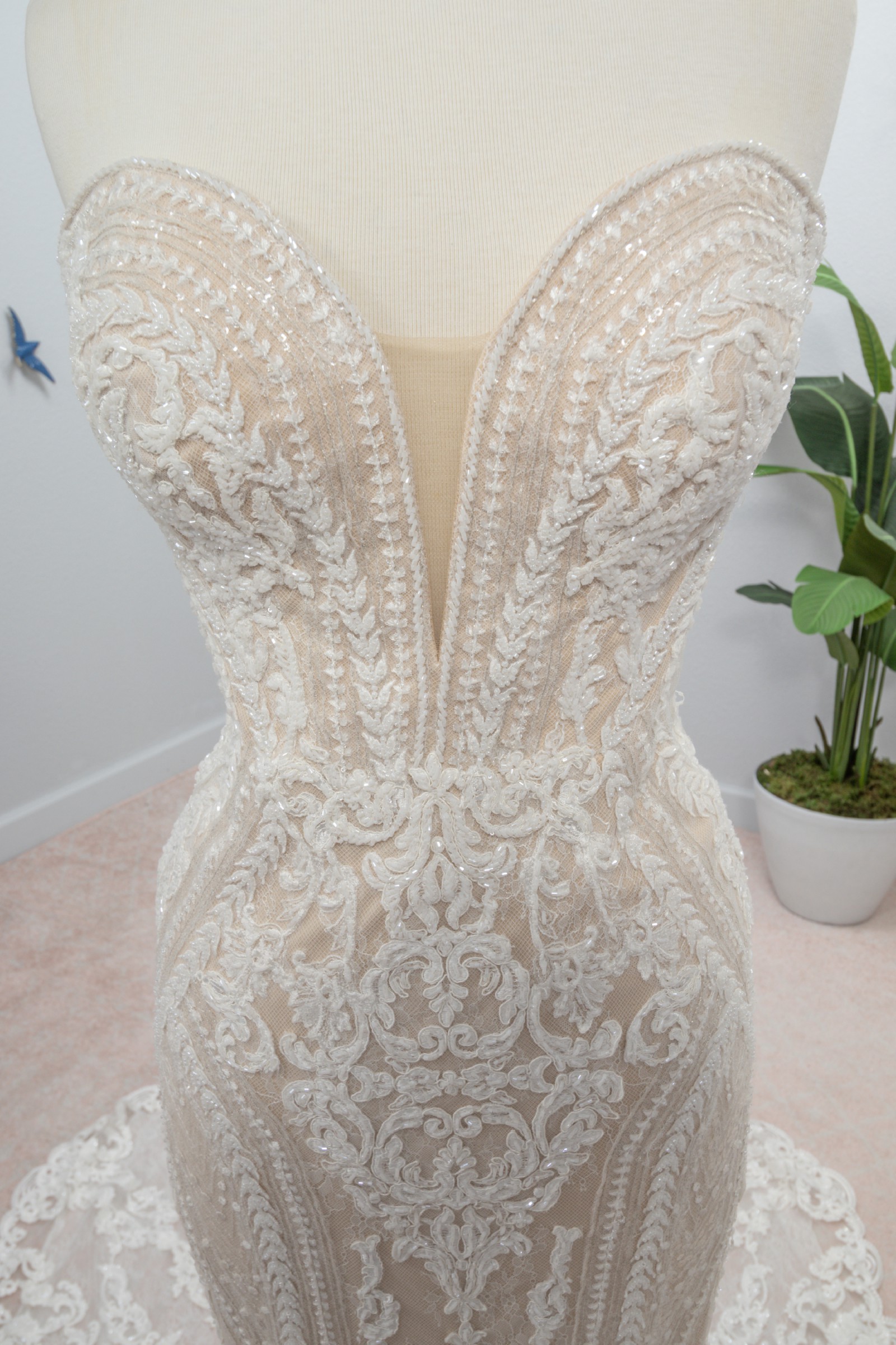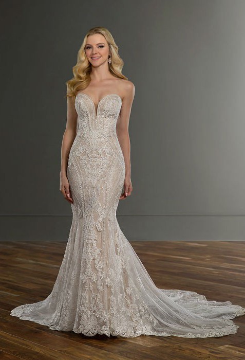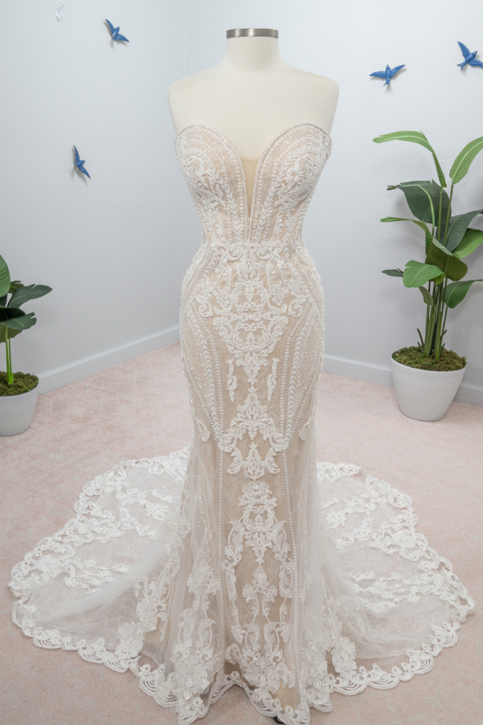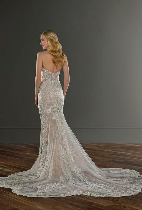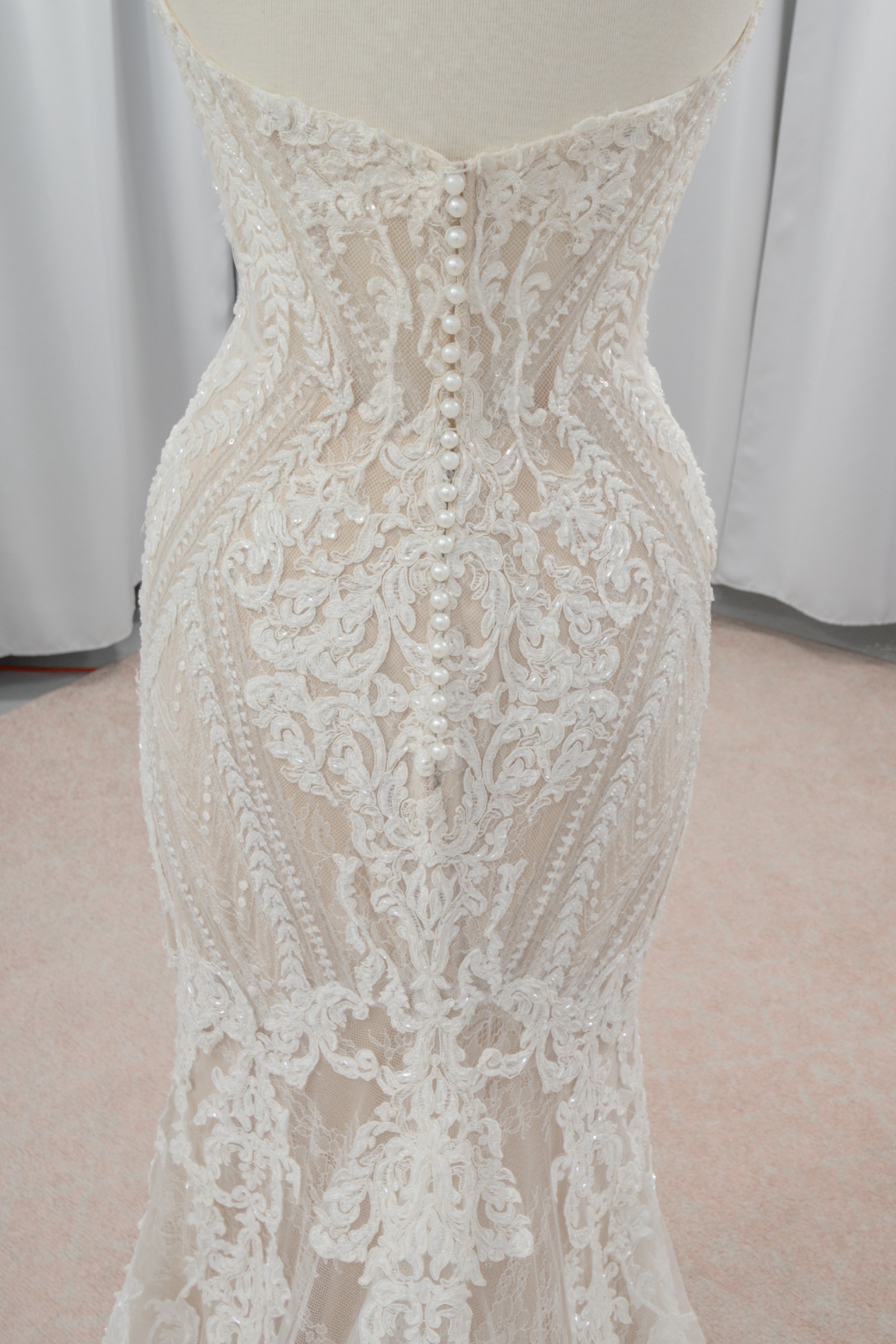 Sexy, elevated and utterly exquisite—this strapless fit-and-flare bridal gown is just the thing for your modern wedding day. A mix of floral and graphic laces are cut into linear patterns and placed thoughtfully throughout this silhouette to elongate the frame and enhance your curves. Soft cutouts draw in the waist further, creating an enviable figure! Silver embroidery adds a slight shimmer to the design, placed artfully amidst Swiss dot details for added visual interest. The skirt flares into a stunning sheer train overlay with scalloped shaping with a graphic lace hem, and the back of the wedding dress zips beneath pearl buttons for a final touch of classic inspiration.