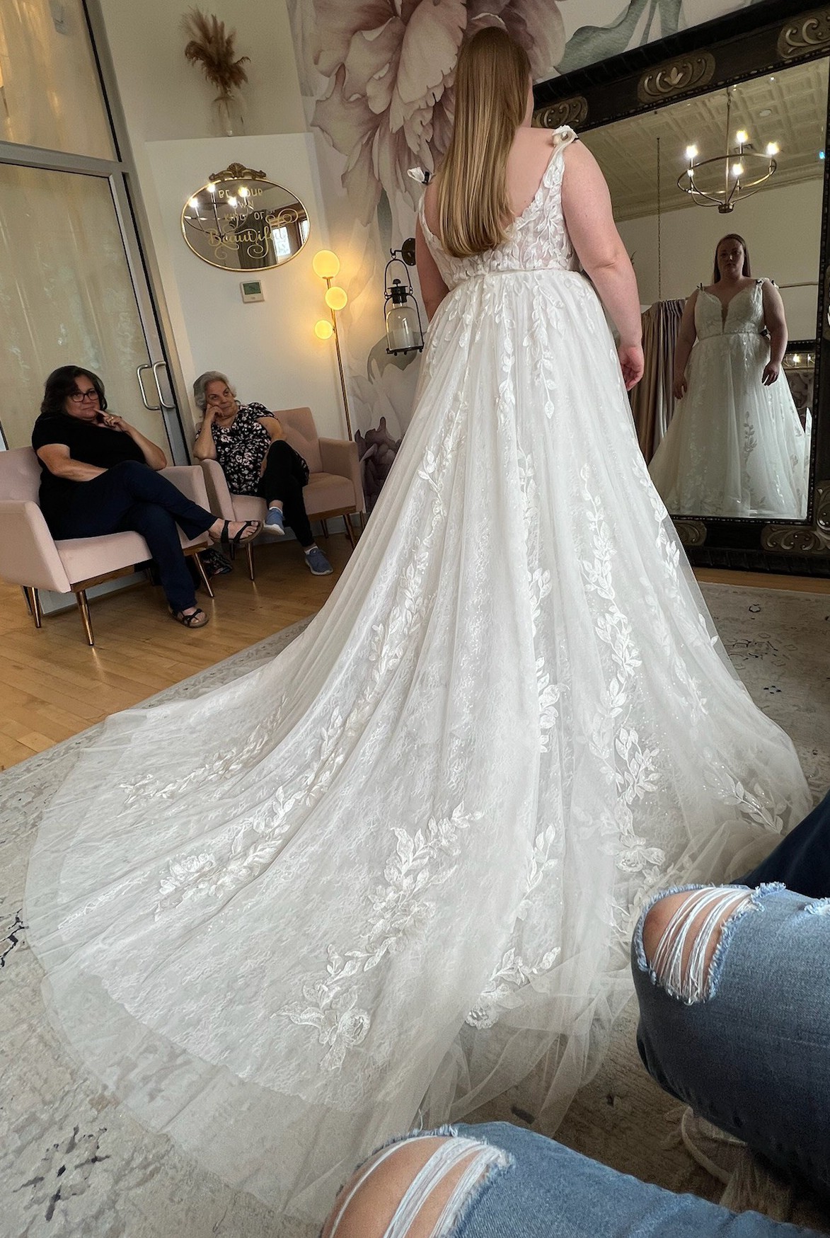 Botanical inspired leafy lace appliqués make this sparkly A-line bridal dress a dream come true. Designed with a sheer bodice, it features a flattering and sexy plunging V-neckline paired with a V-back. A Chantilly lace underlay adds soft detailing while the sequined appliqués offer allover sparkle. The effortless style is finished with a chapel length train. For a more modest look, this style is also available to order with the bodice lined to the side seams.