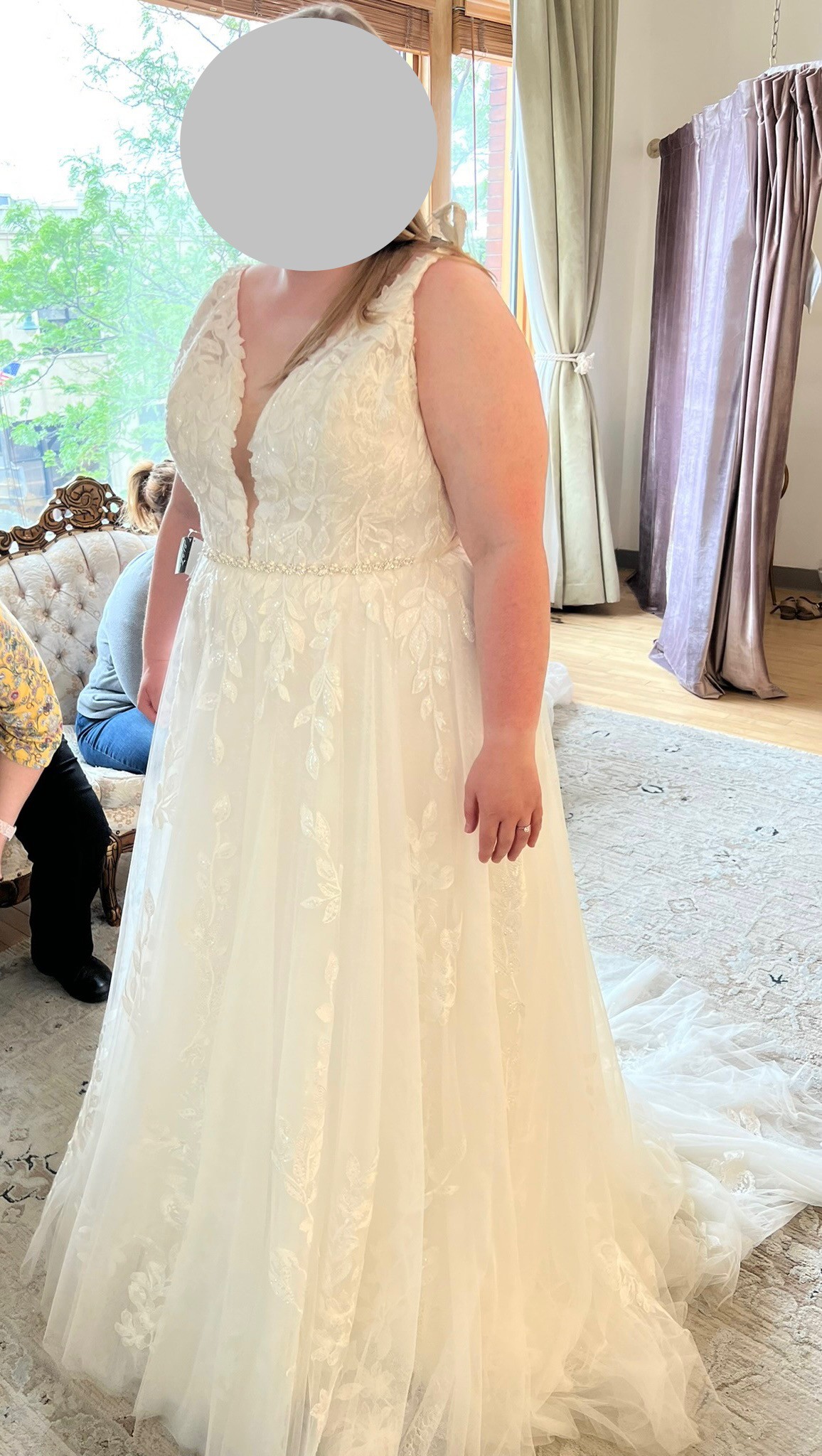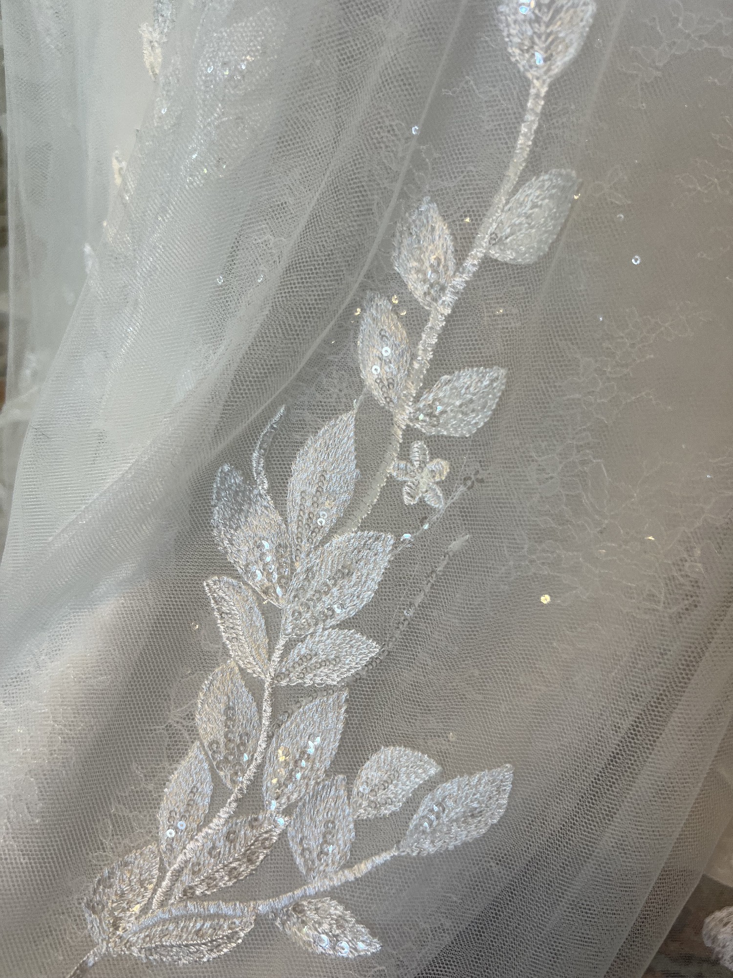 Fabric: Allover Sequined Chantilly Lace, English Net, Lining, Organza, Satin Lining, Sequin Lace Appliques, Tulle
