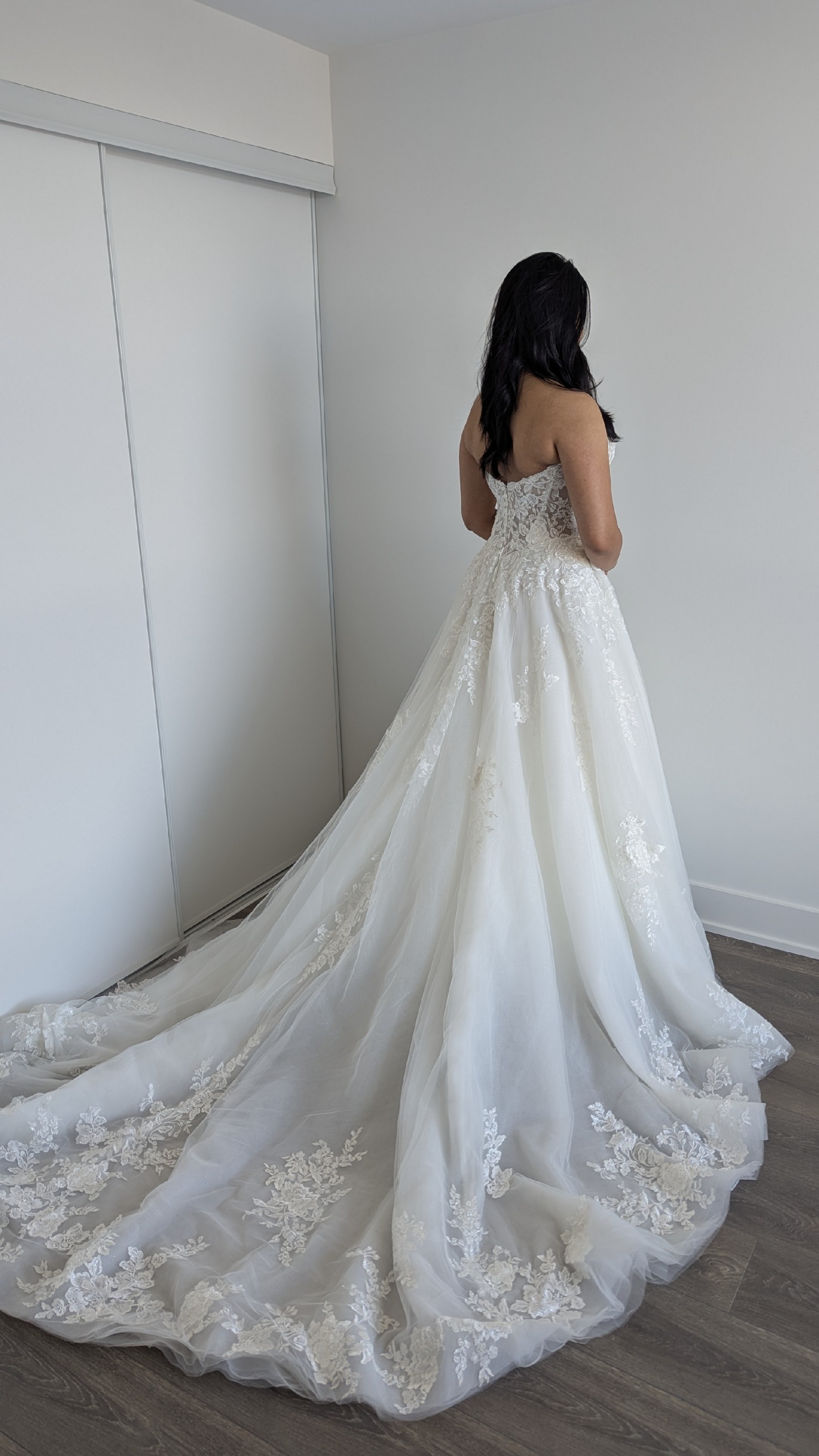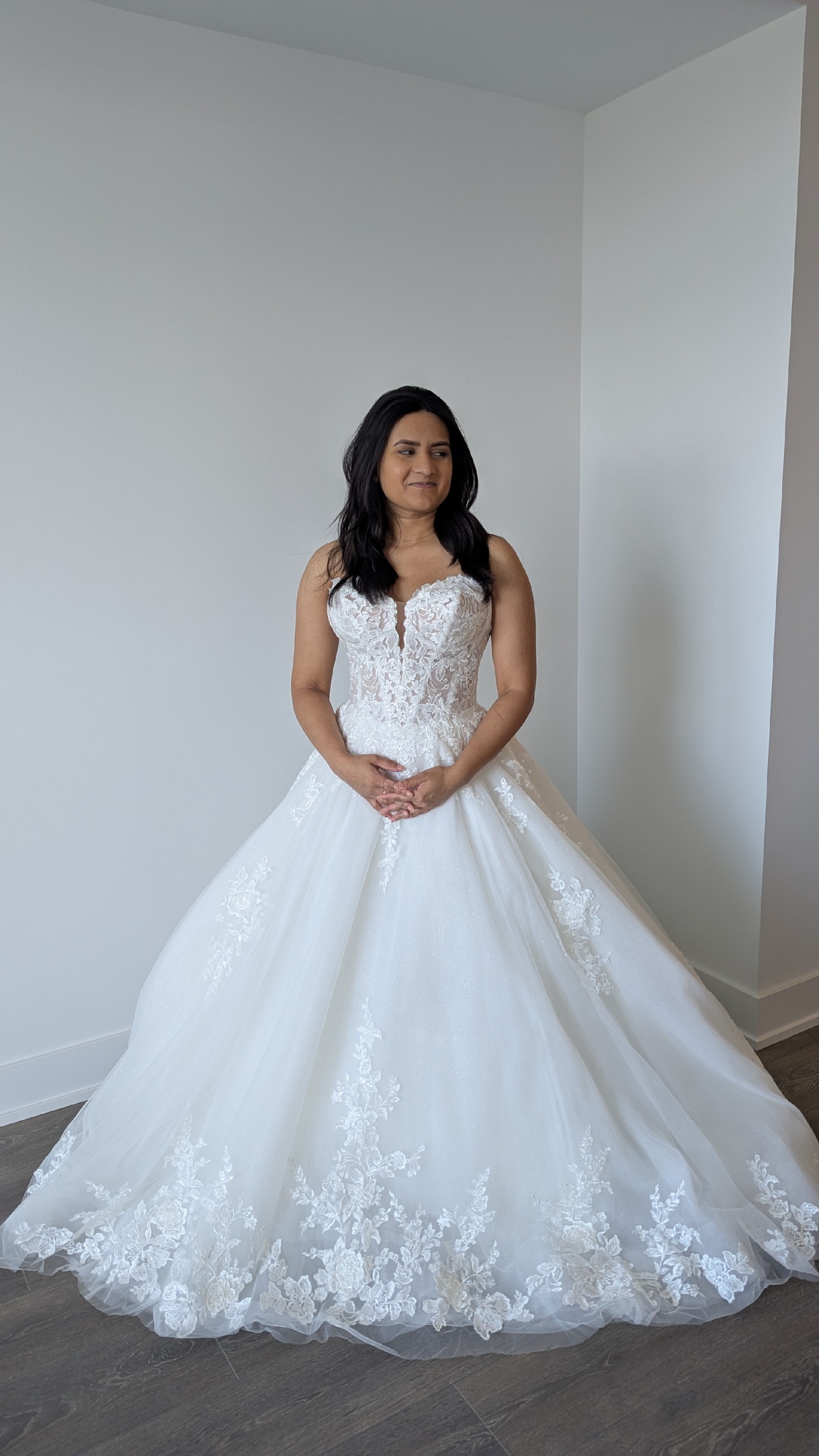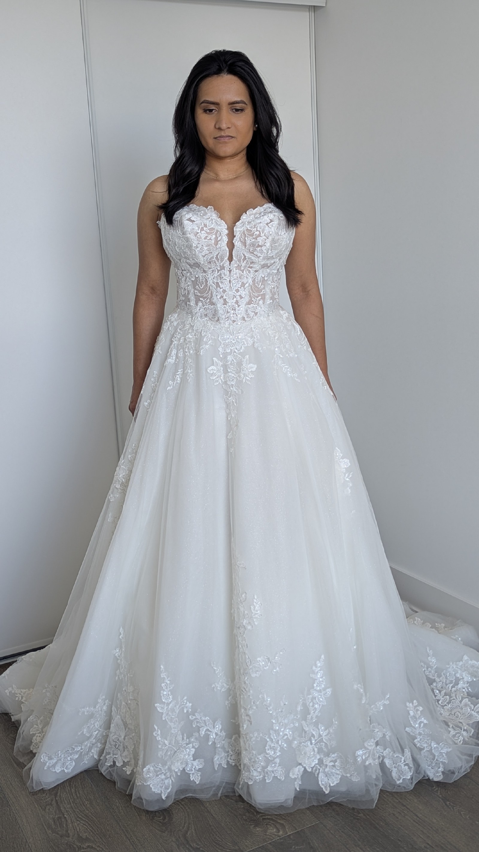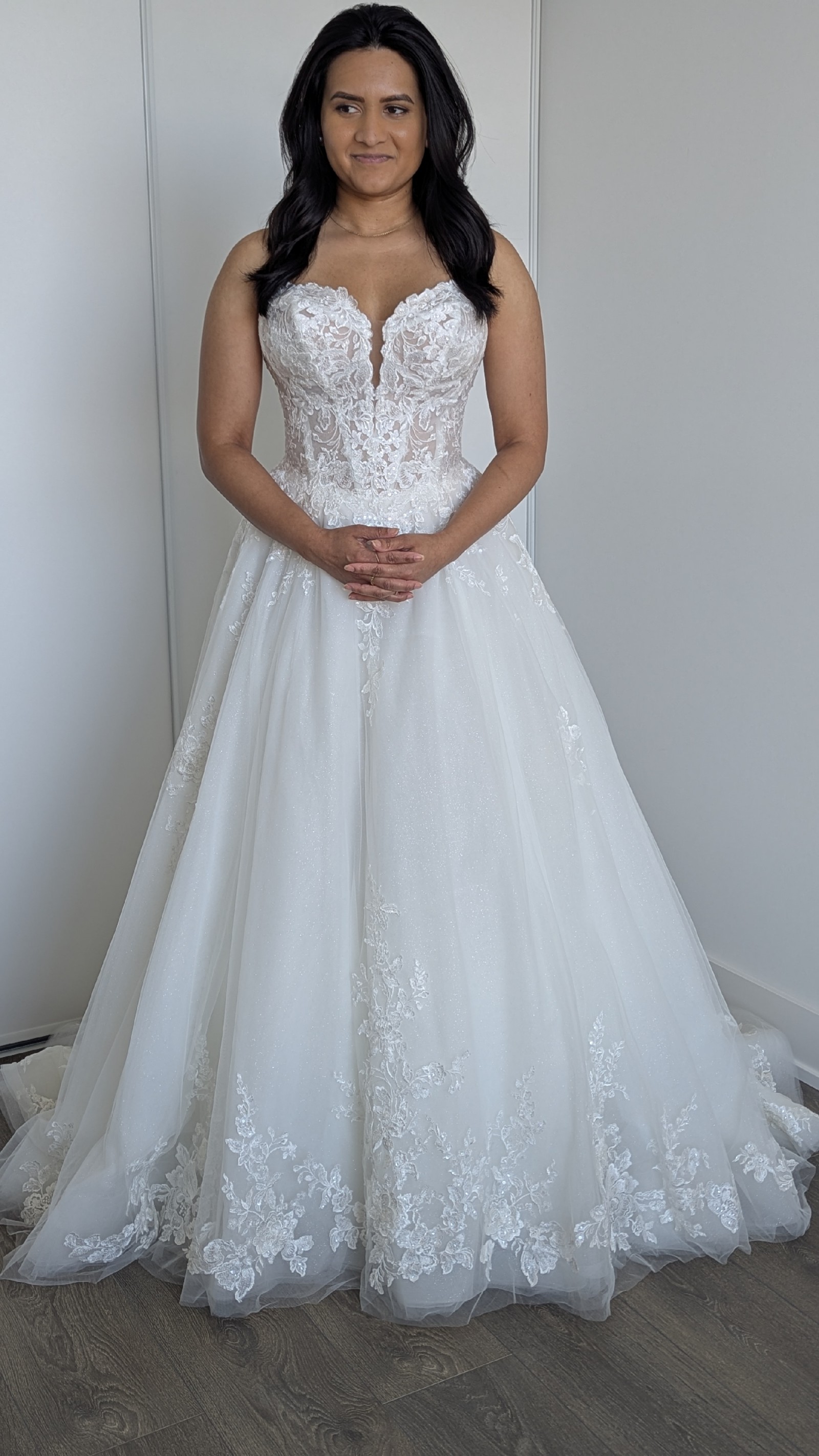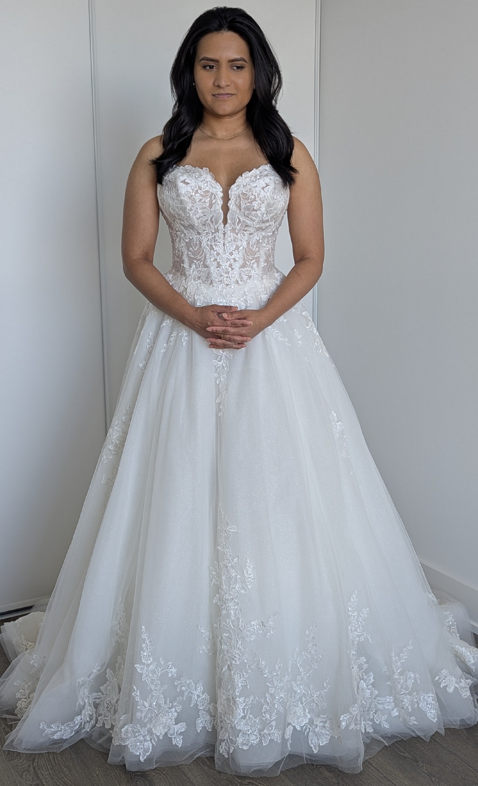 It's crafted from luxurious Glitter Tulle & Organza, Misty Tulle, and Sequined Schiffli Lace Appliqué. The dress has a soft shimmer and dimensional detail that catch the light beautifully without being overwhelming. The built-in corset in the abdomen area provides flattering support, so there’s no need for a separate body shaper.
