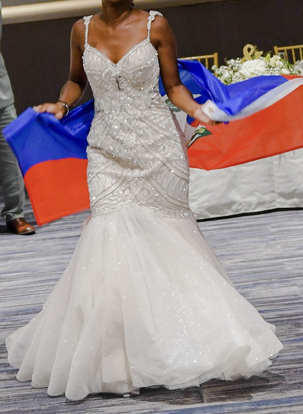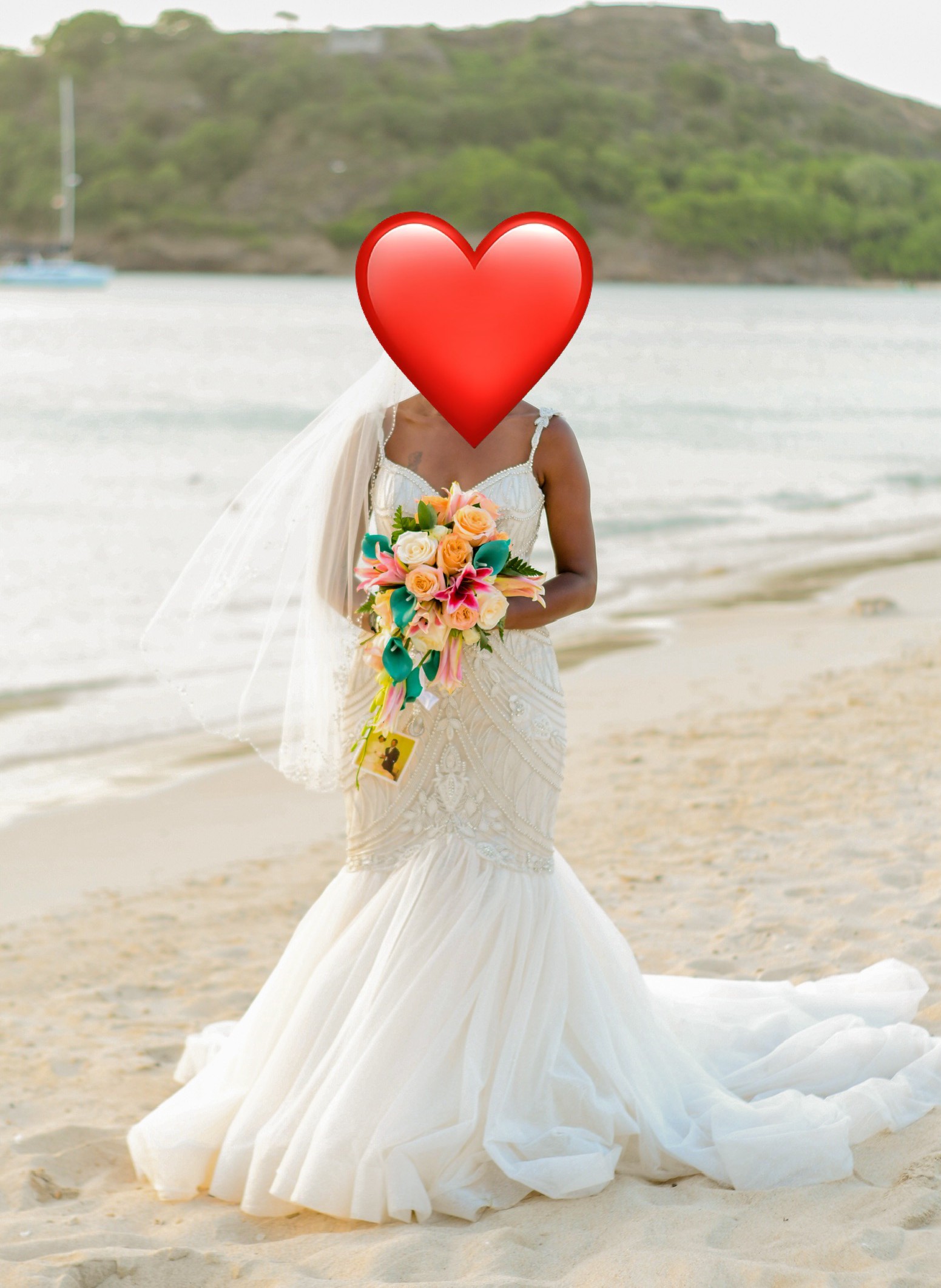 This breathtaking Eve of Milady Style 374 gown features a dramatic ball gown silhouette, intricate hand-beaded bodice, and romantic off-the-shoulder neckline. The gown was worn once for a wedding ceremony and has since been professionally dry cleaned and preserved in a bridal keepsake box. Perfect for brides dreaming of a luxurious, regal look on their special day.