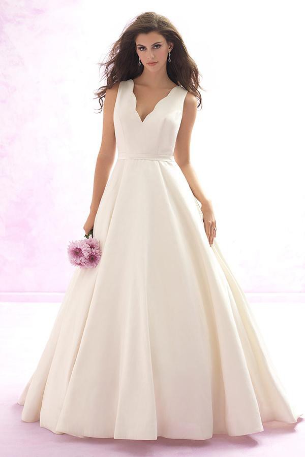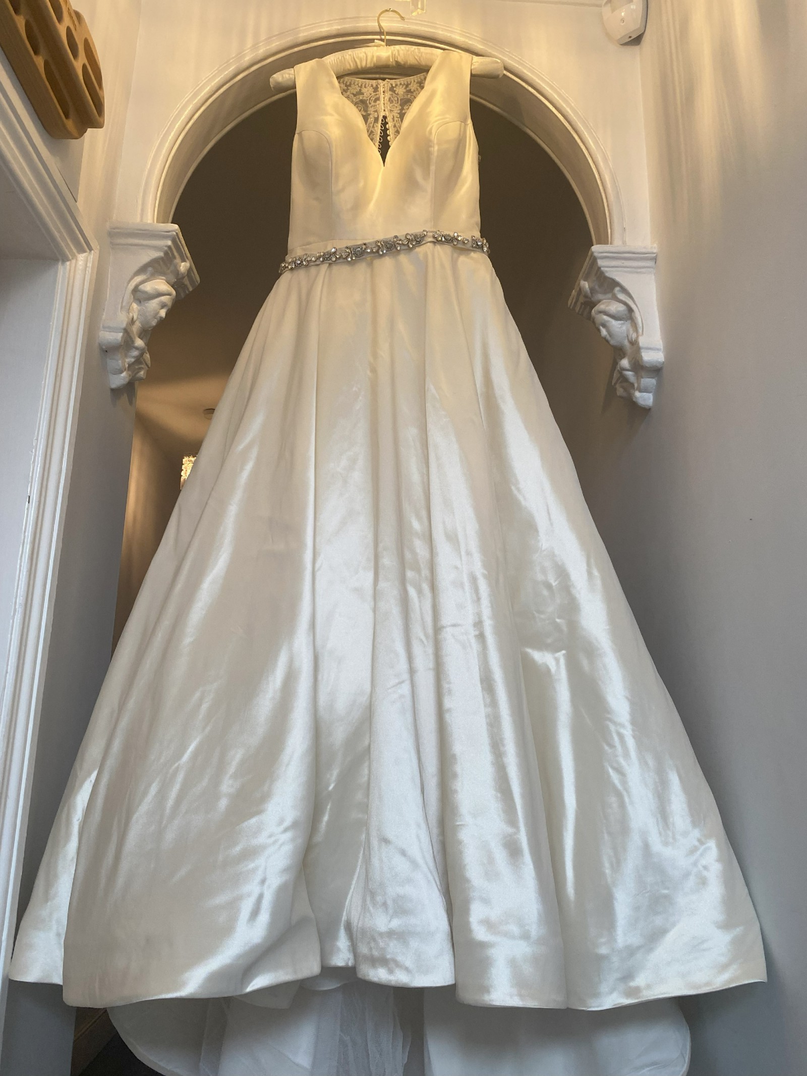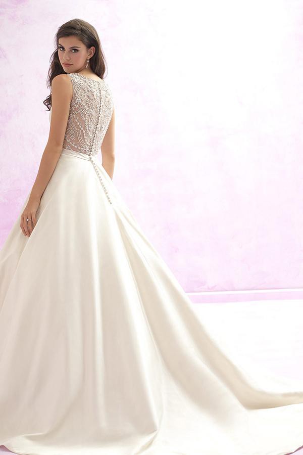 A timeless and elegant Madison James gown in soft ivory satin, featuring a flattering scalloped V-neckline, stunning beaded illusion back, and a flowing A-line skirt with a chapel-length train. Perfect for a bride looking for classic sophistication.