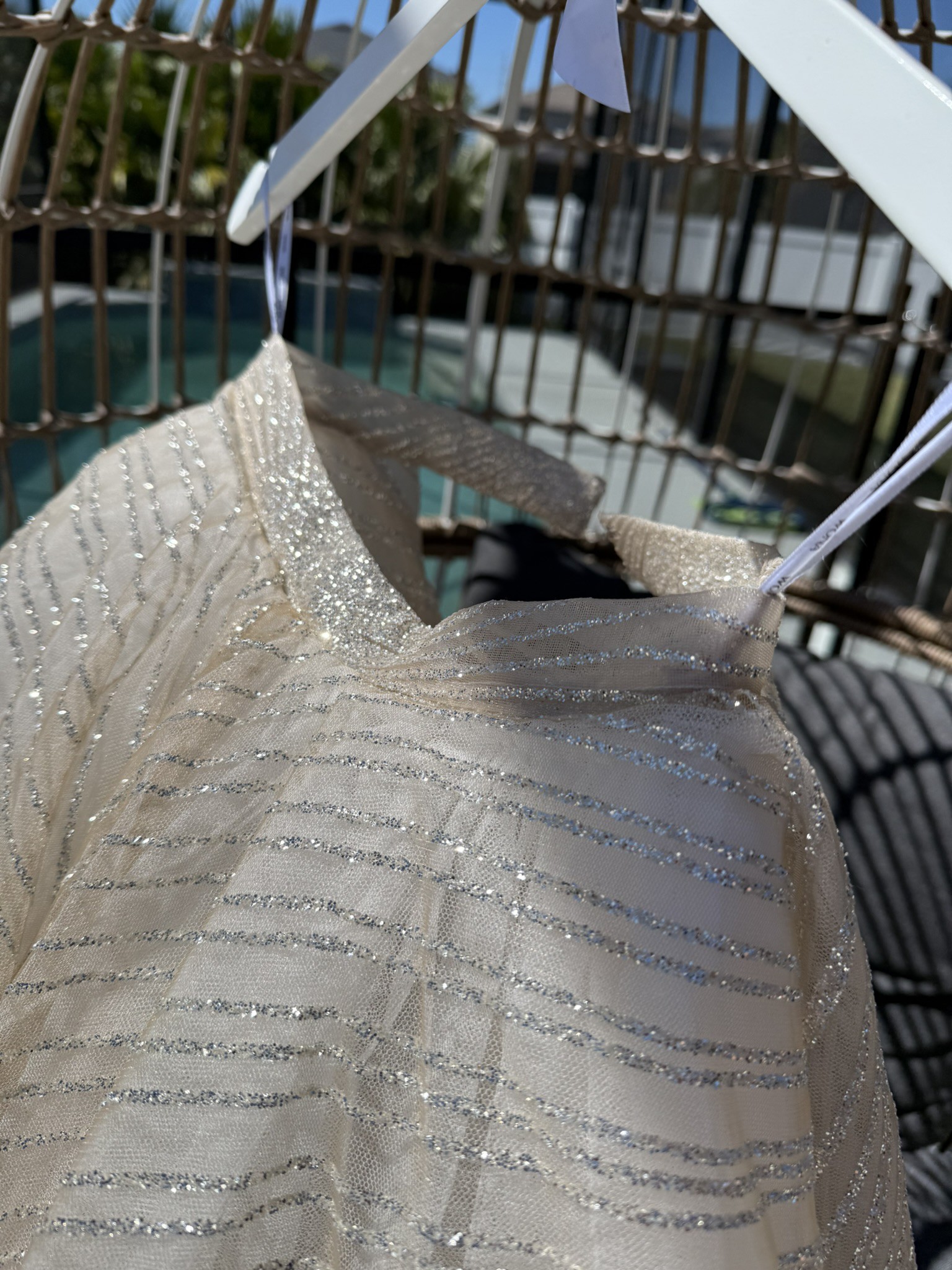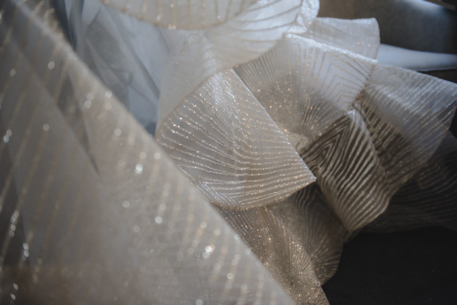 The fabric is surprisingly light for such intricate detailing! It moves with ease and catches the light beautifully. I felt like I was floating. It’s structured enough to feel secure but still soft and flexible enough to dance in all night.