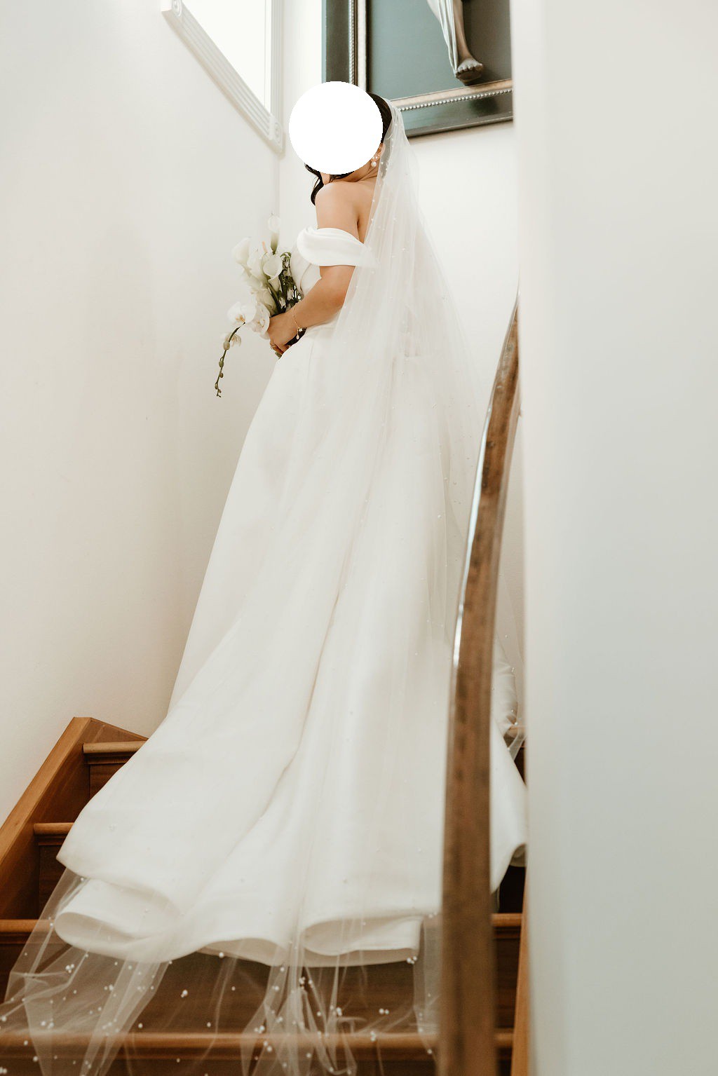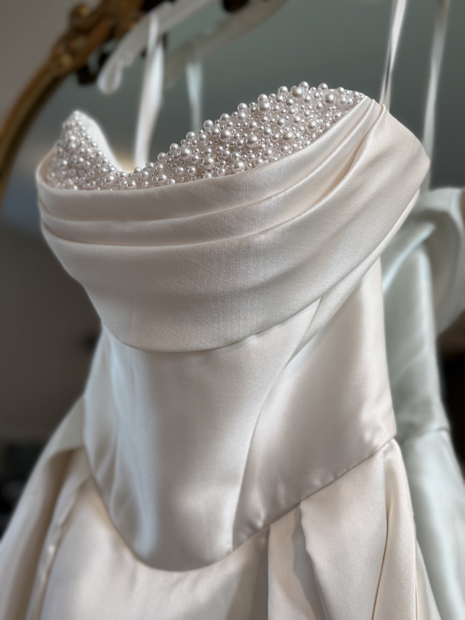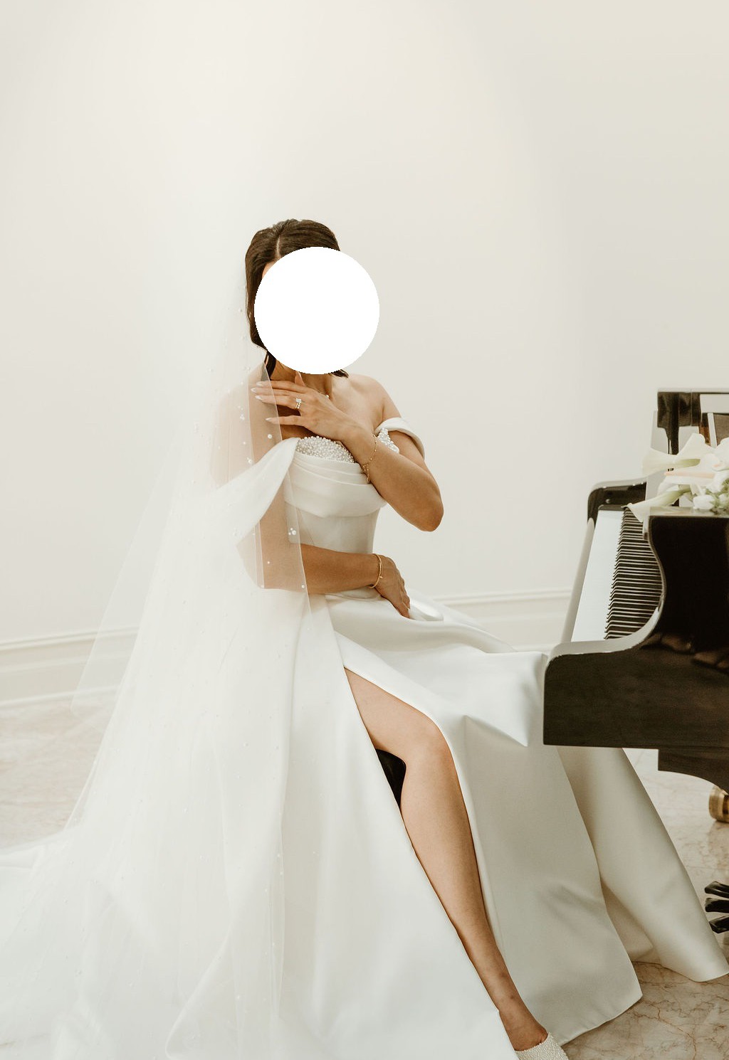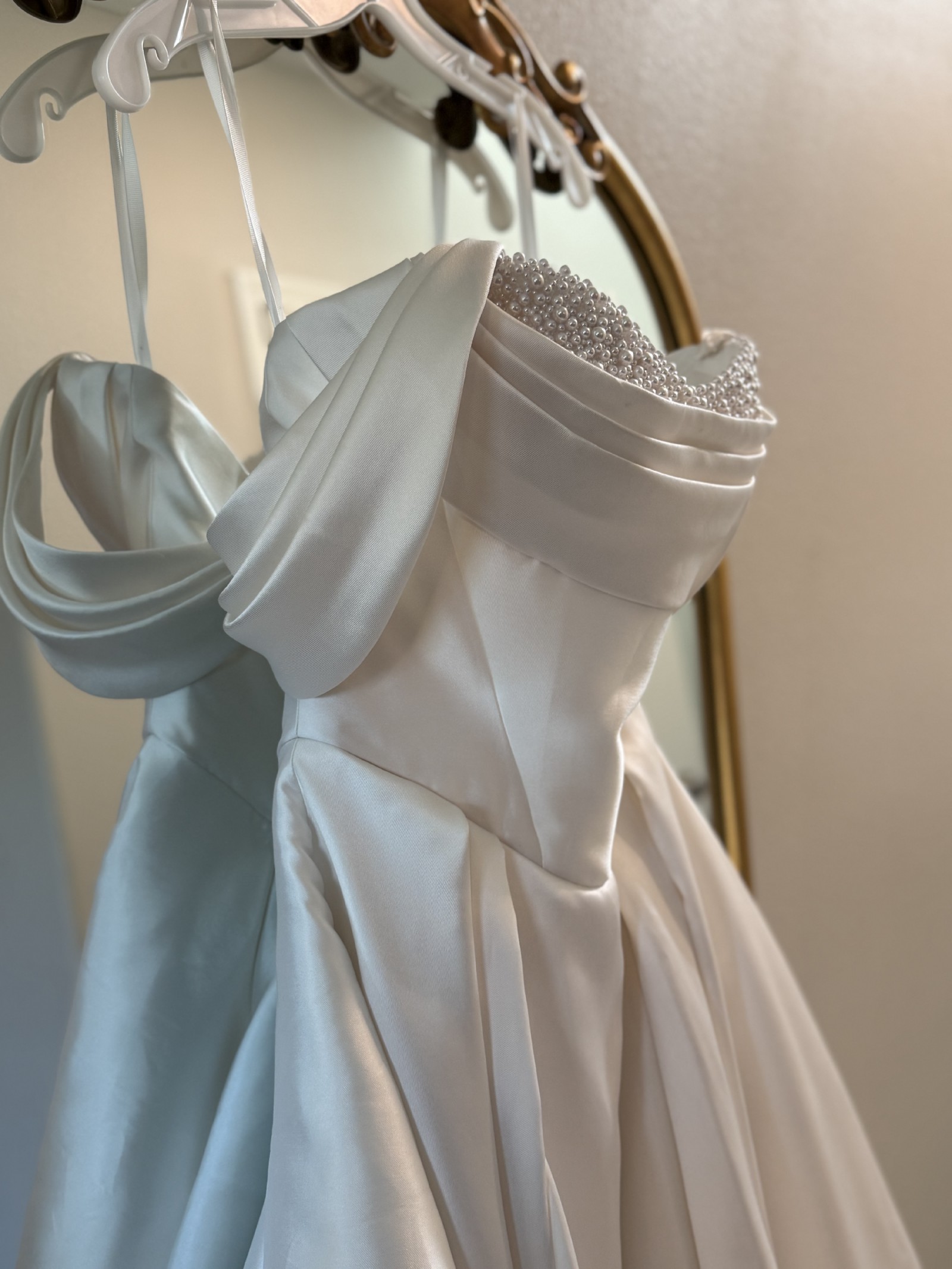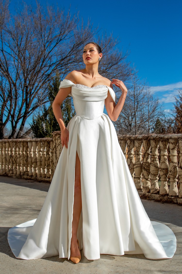 This gown exudes timeless sophistication and modern elegance. Featuring a structured off-the-shoulder neckline with soft draping, it highlights the collarbone beautifully while offering a touch of regal charm. The fitted bodice cinches at the waist and flows into a dramatic full skirt with a high slit, adding a hint of boldness to its classic silhouette. The clean lines and luxurious fabric make it a perfect choice for a bride seeking a striking yet refined look on her wedding day.