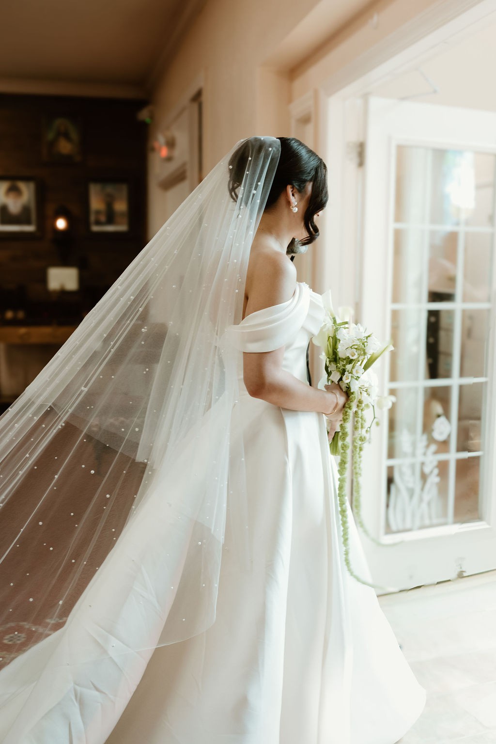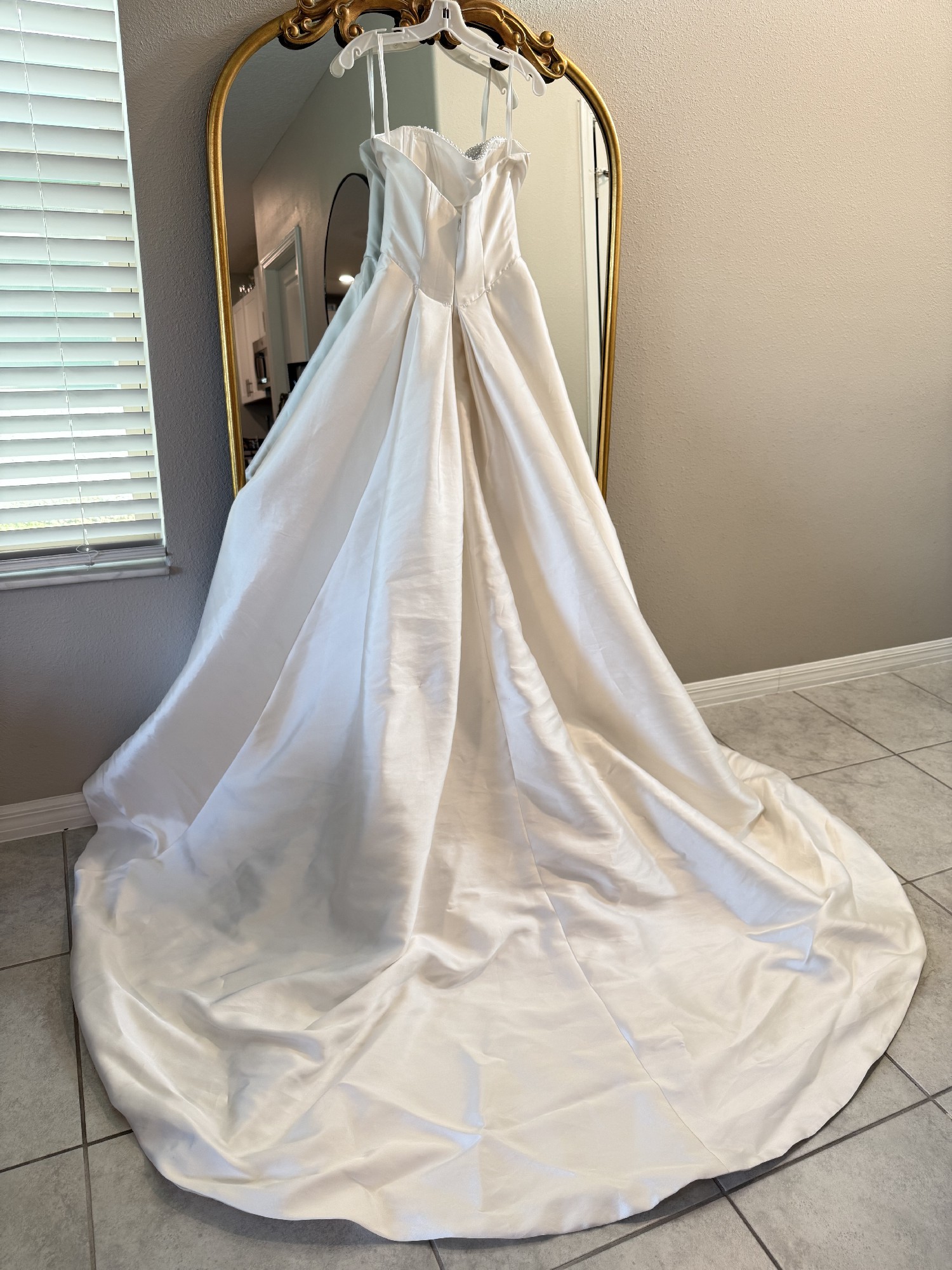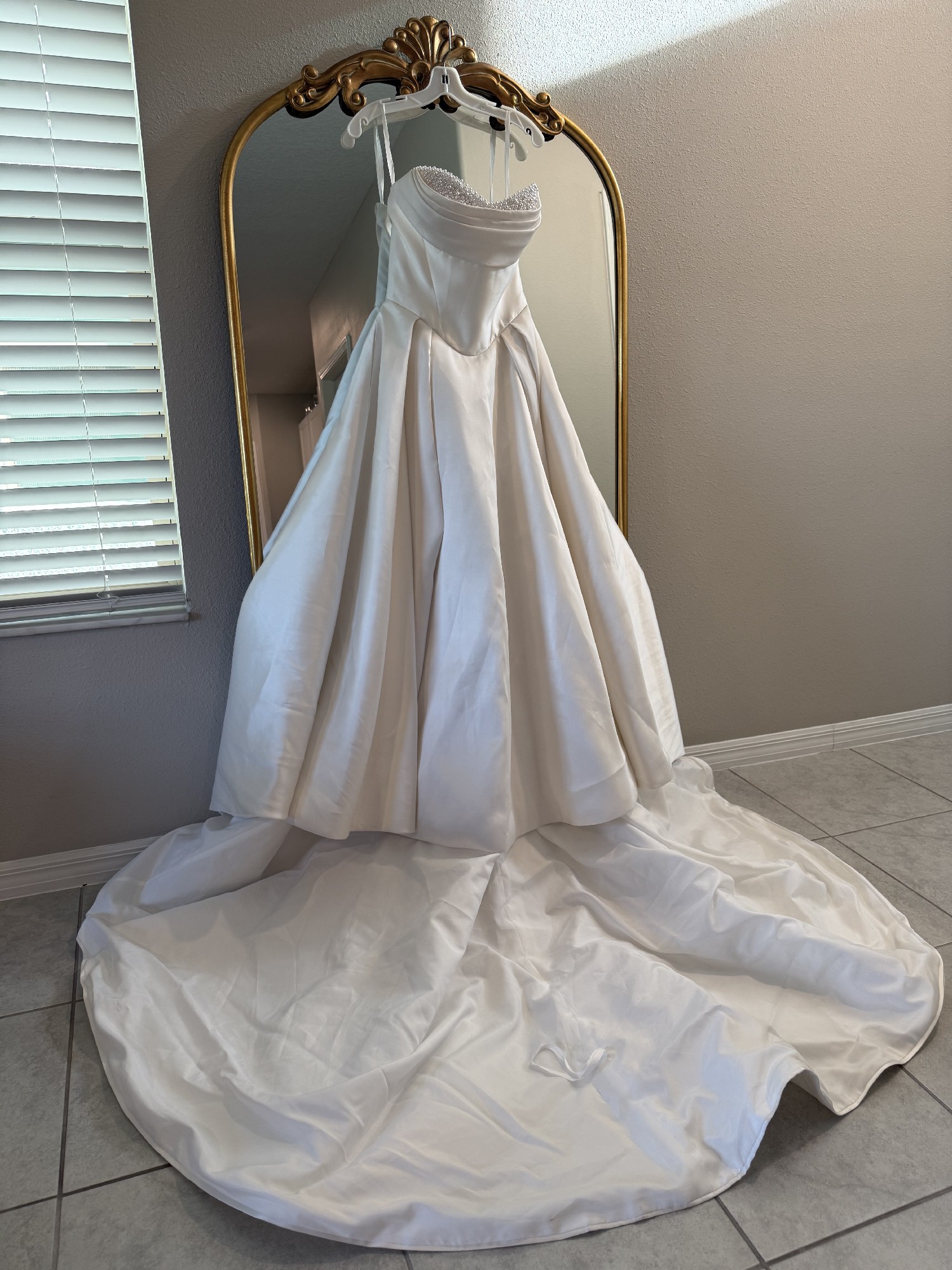 Includes cathedral pearled drop veil with blusher. As seen in pictures.