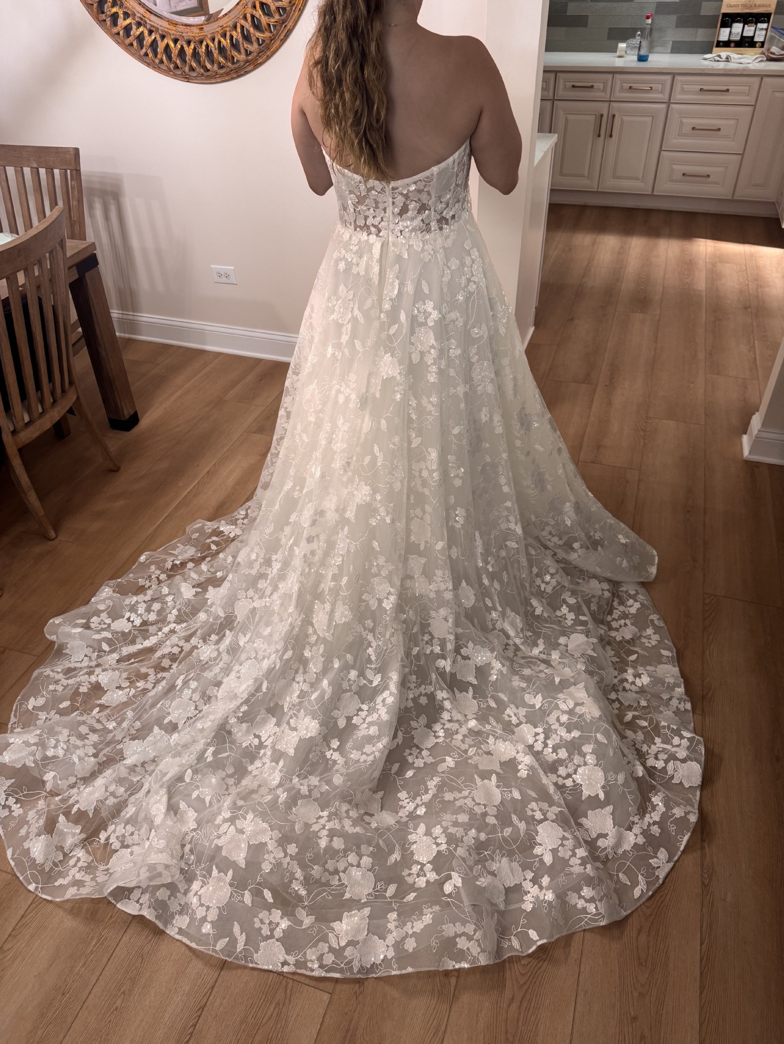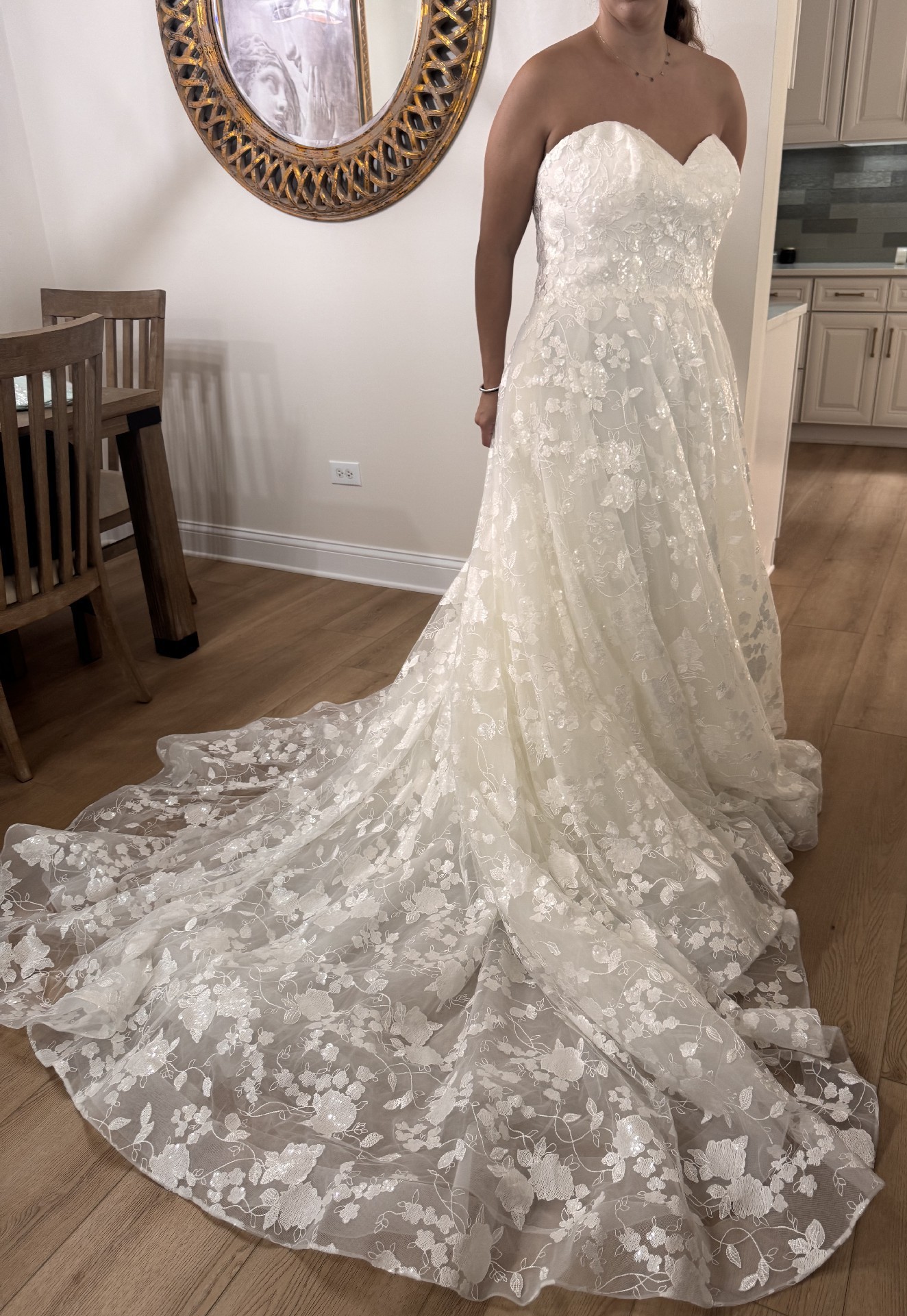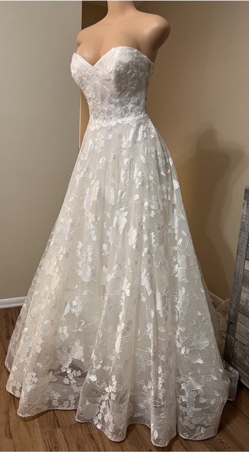 I bought this dress and lost a lot of weight, and decided to go with a different style dress. It is truly stunning (pictures do not do it justice) and perfect for the bride that is going for a romantic ethereal vibe. Fits a size 16. Unaltered. Comes bustled. Lace pattern with sequins, it shines whenever you move! It has a long, beautiful train. Still has the tags on! The dress is ivory. Truly one of a kind dress. Price is negotiable!