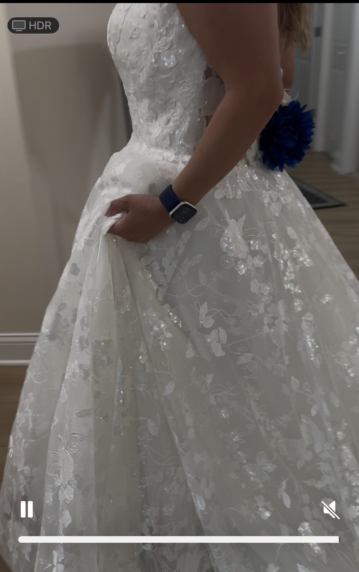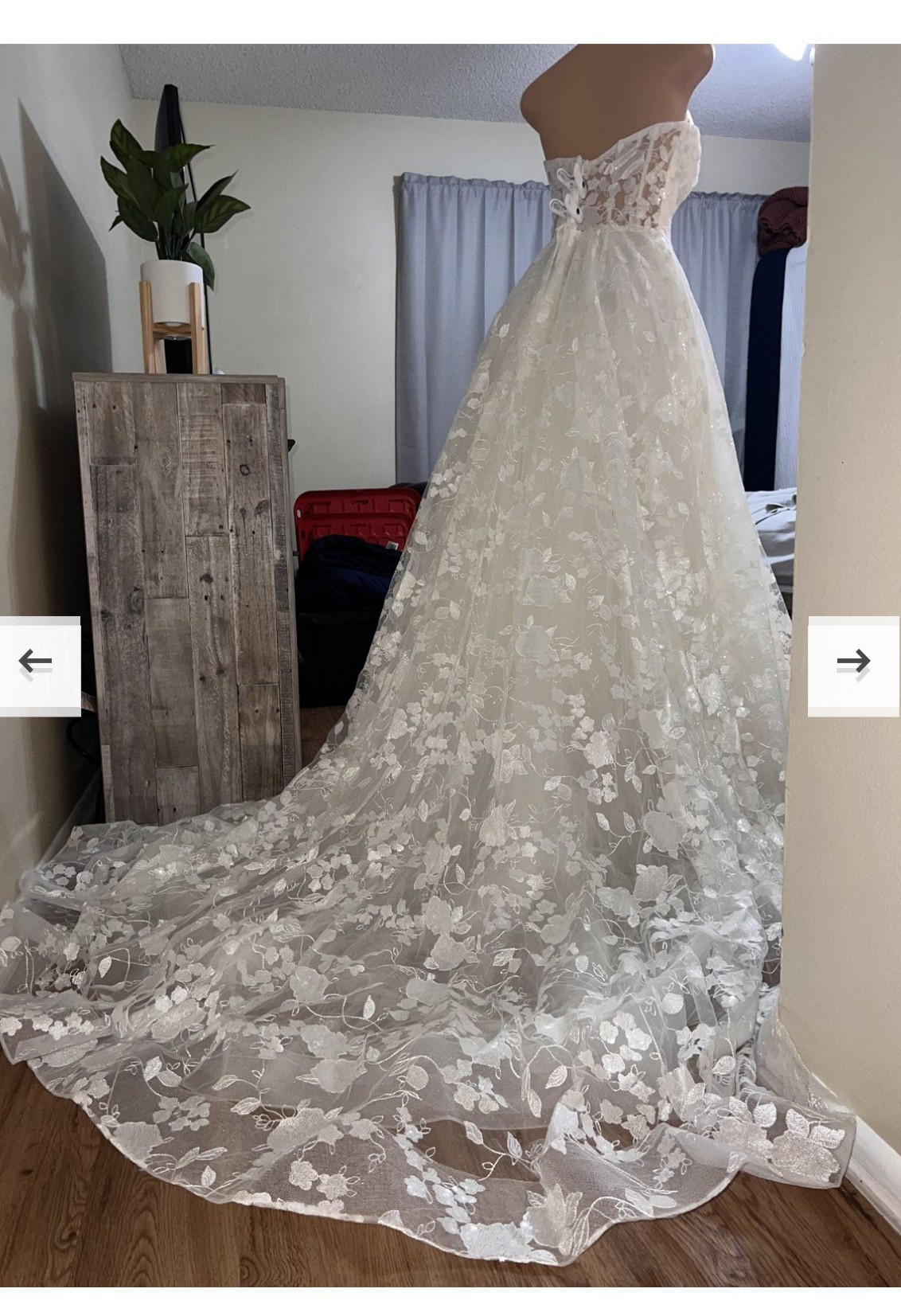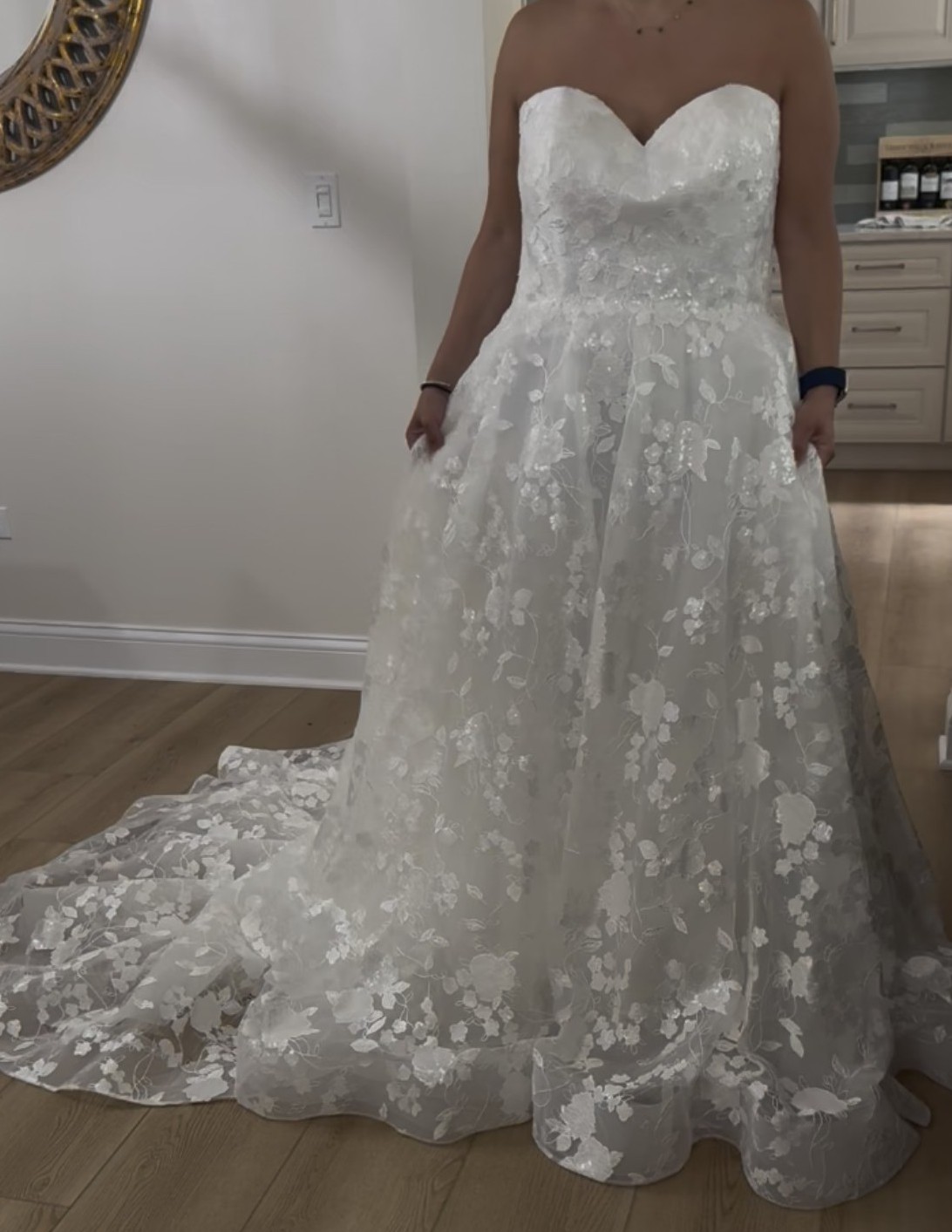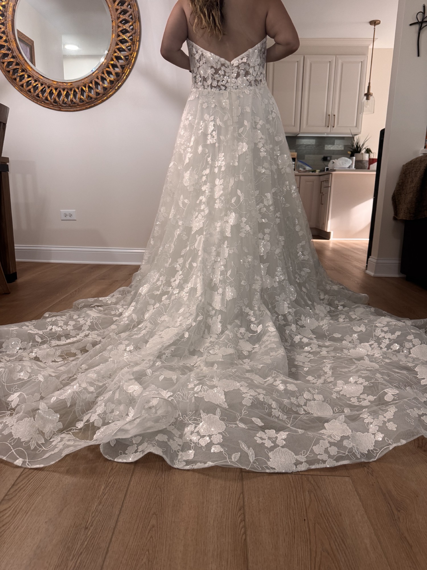 I bought this dress and lost a lot of weight, and decided to go with a different style dress. It is truly stunning (pictures do not do it justice) and perfect for the bride that is going for a romantic ethereal vibe. Fits a size 16. Unaltered. Comes bustled. Lace pattern with sequins, it shines whenever you move! It has a long, beautiful train. Still has the tags on! The dress is ivory. Truly one of a kind dress. Price is negotiable!