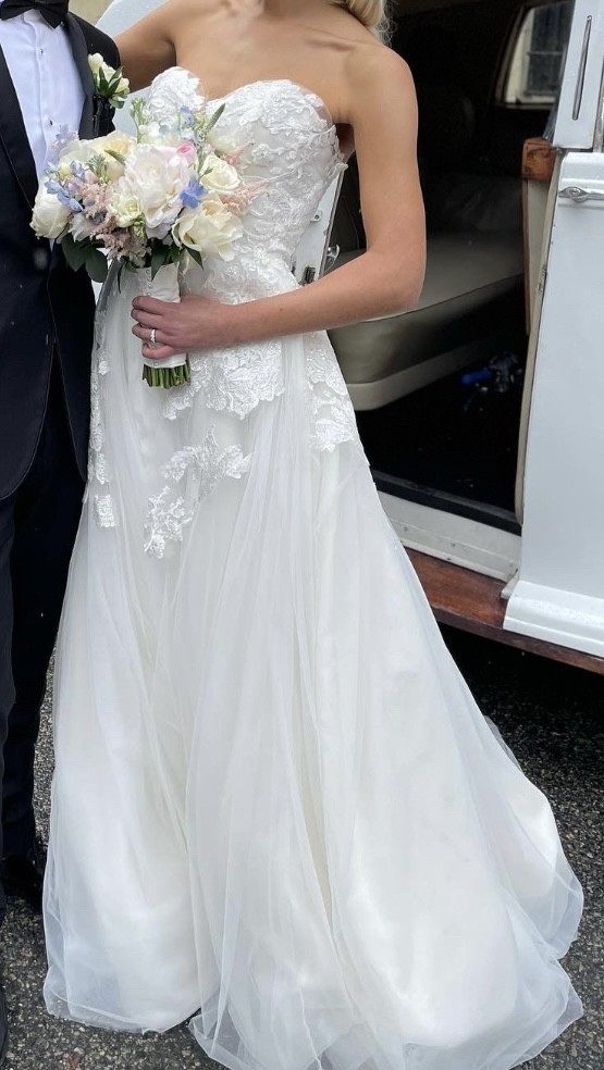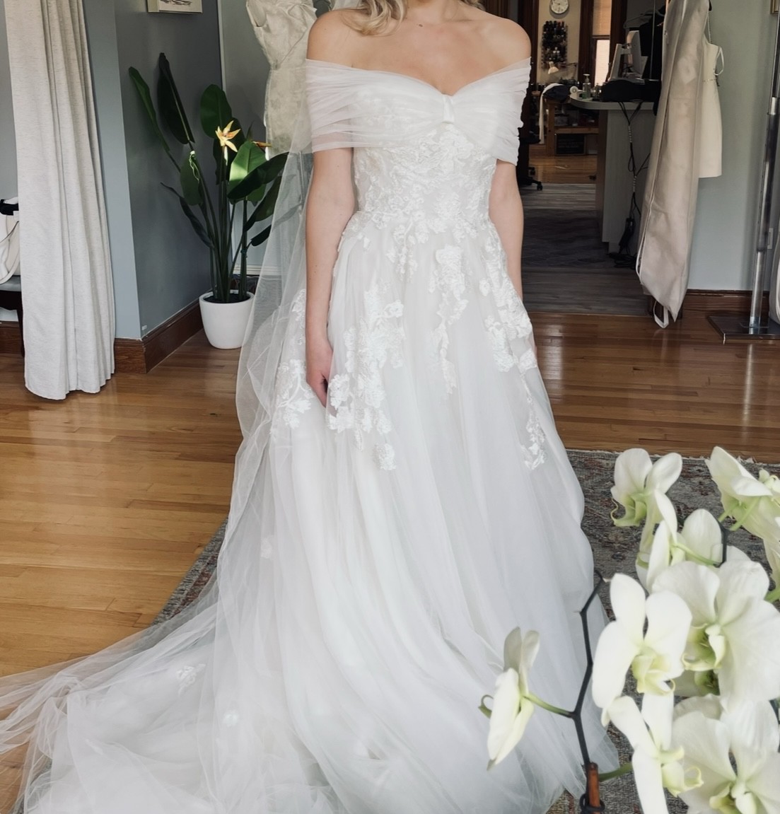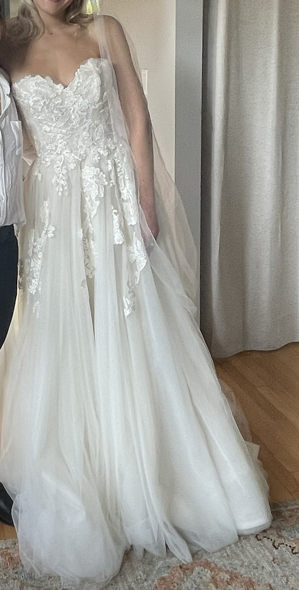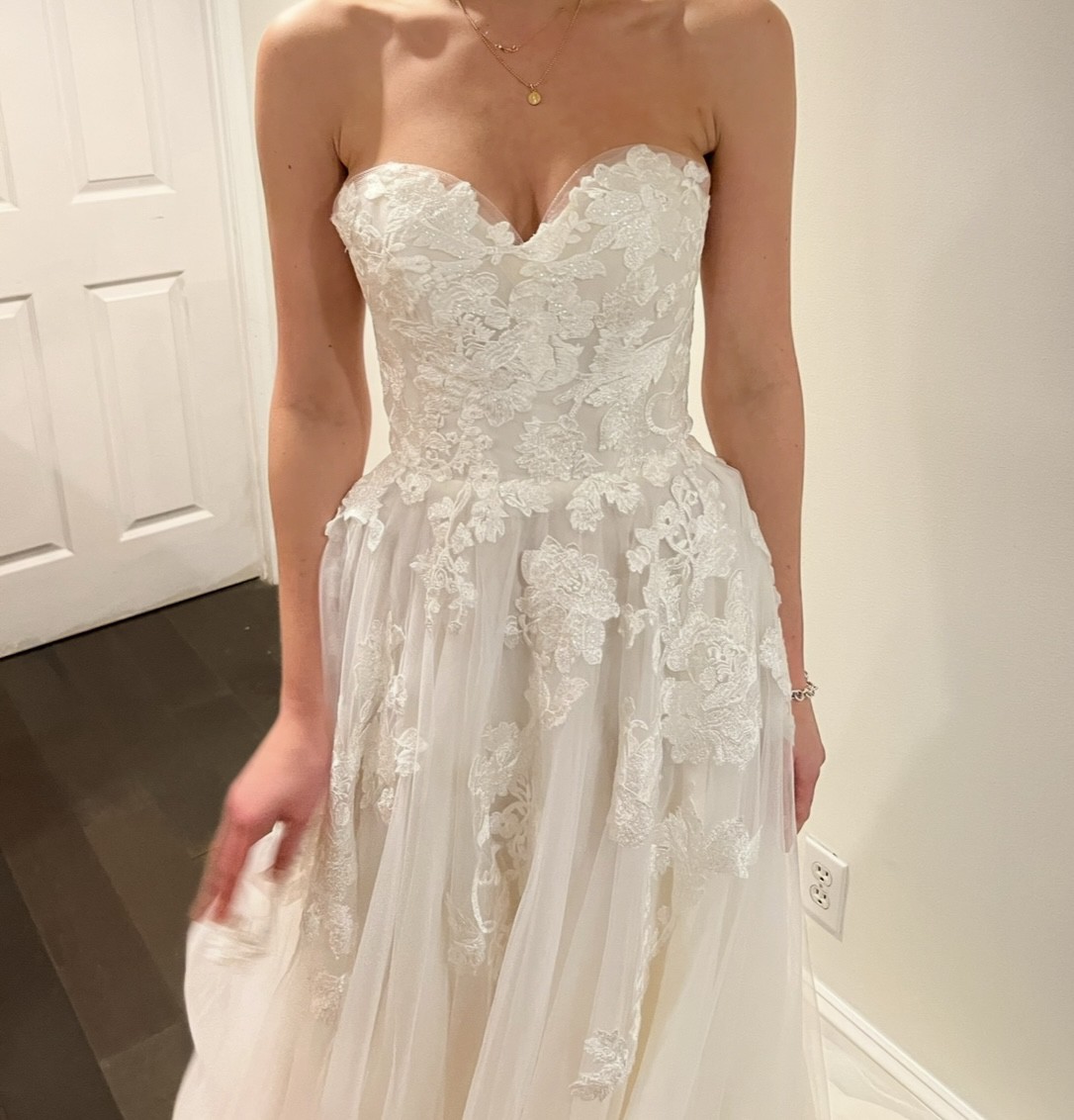 This Moira Hughes wedding dress has been a dream come true for me. The exquisite A-line silhouette and delicate sweetheart neckline created the perfect blend of elegance and romance. The lightweight chiffon fabric flowed beautifully as I walked down the aisle, making me feel like I was floating on air.