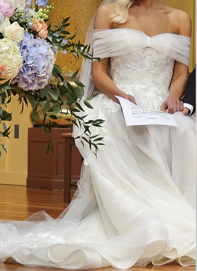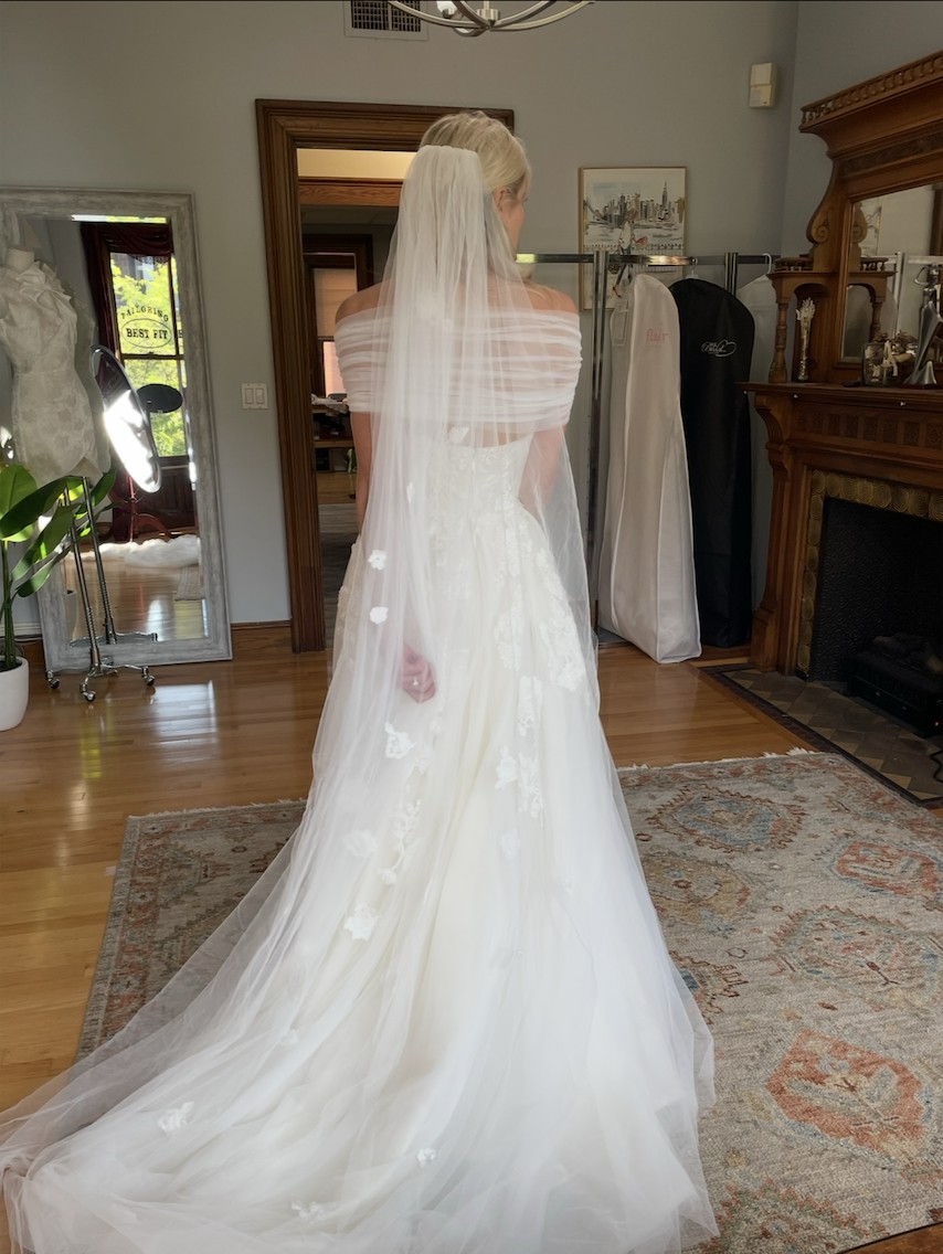 What truly sets this gown apart are the stunning 3D flowers and intricate beading that add a touch of whimsy and sparkle to the overall design. I loved the detachable tulle shrug, which allowed me to customize my look for the ceremony and reception effortlessly. The low back detail offered just the right hint of seduction while maintaining an air of sophistication.