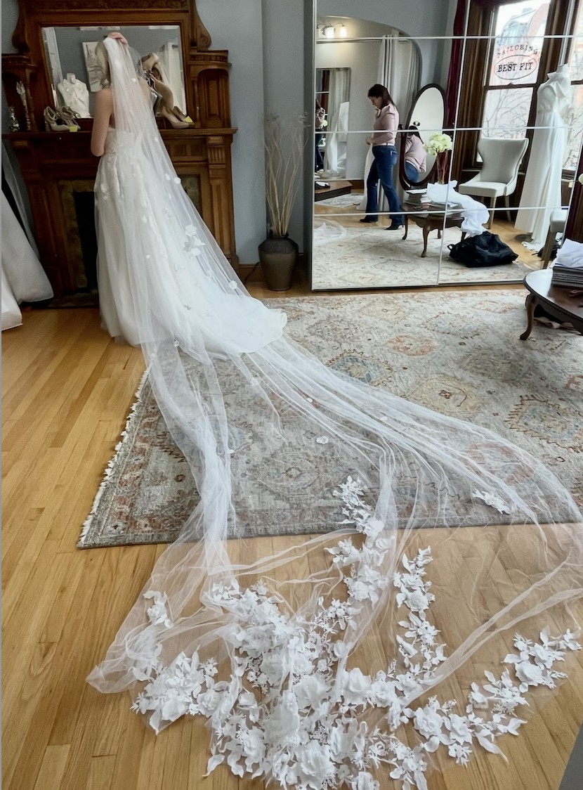 In addition to the dress, I am including a gorgeous, cathedral length veil that perfectly complements the ensemble, ensuring you feel nothing short of magical on your big day. Don’t miss your chance to own this enchanting piece of artistry!