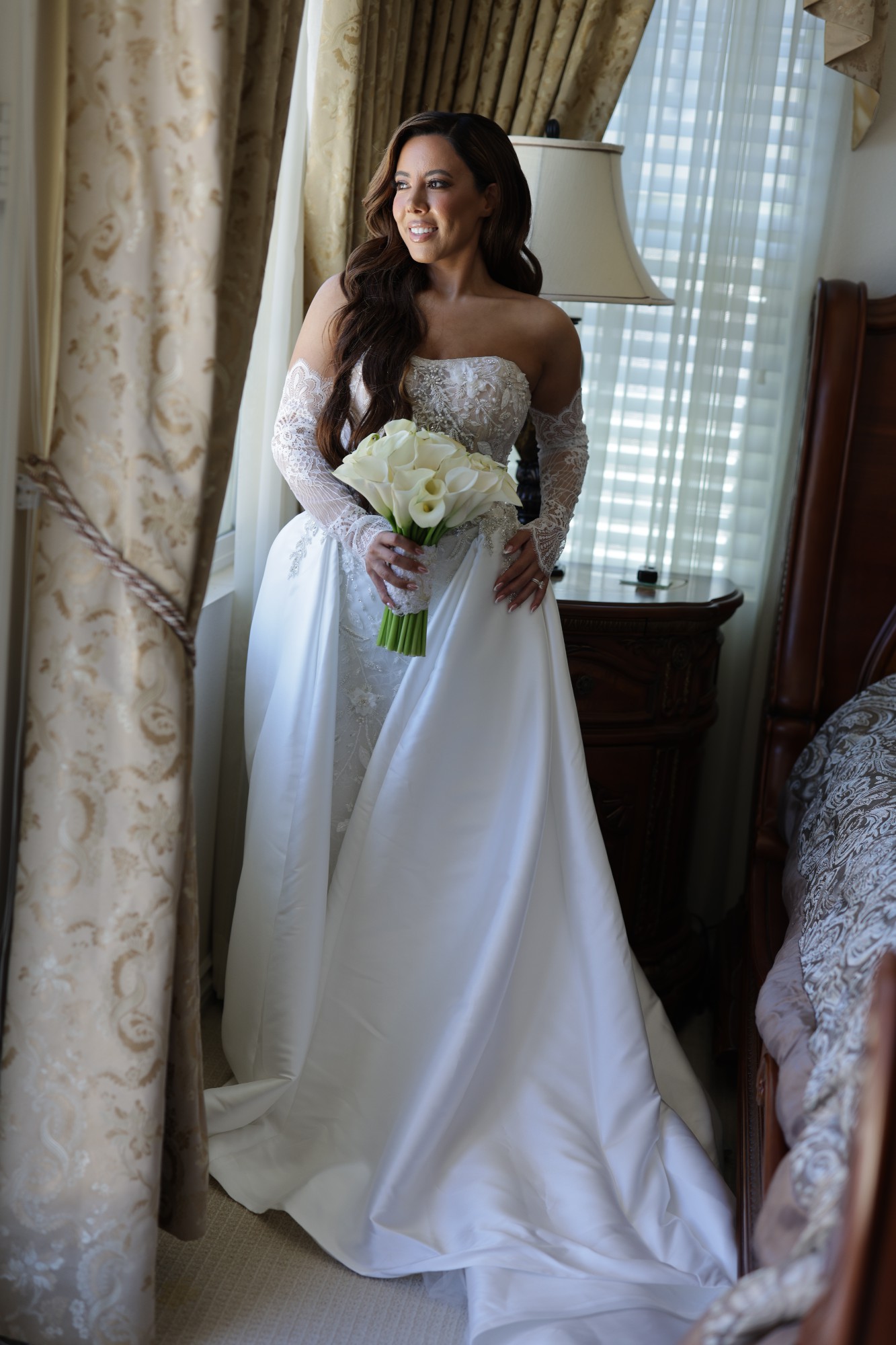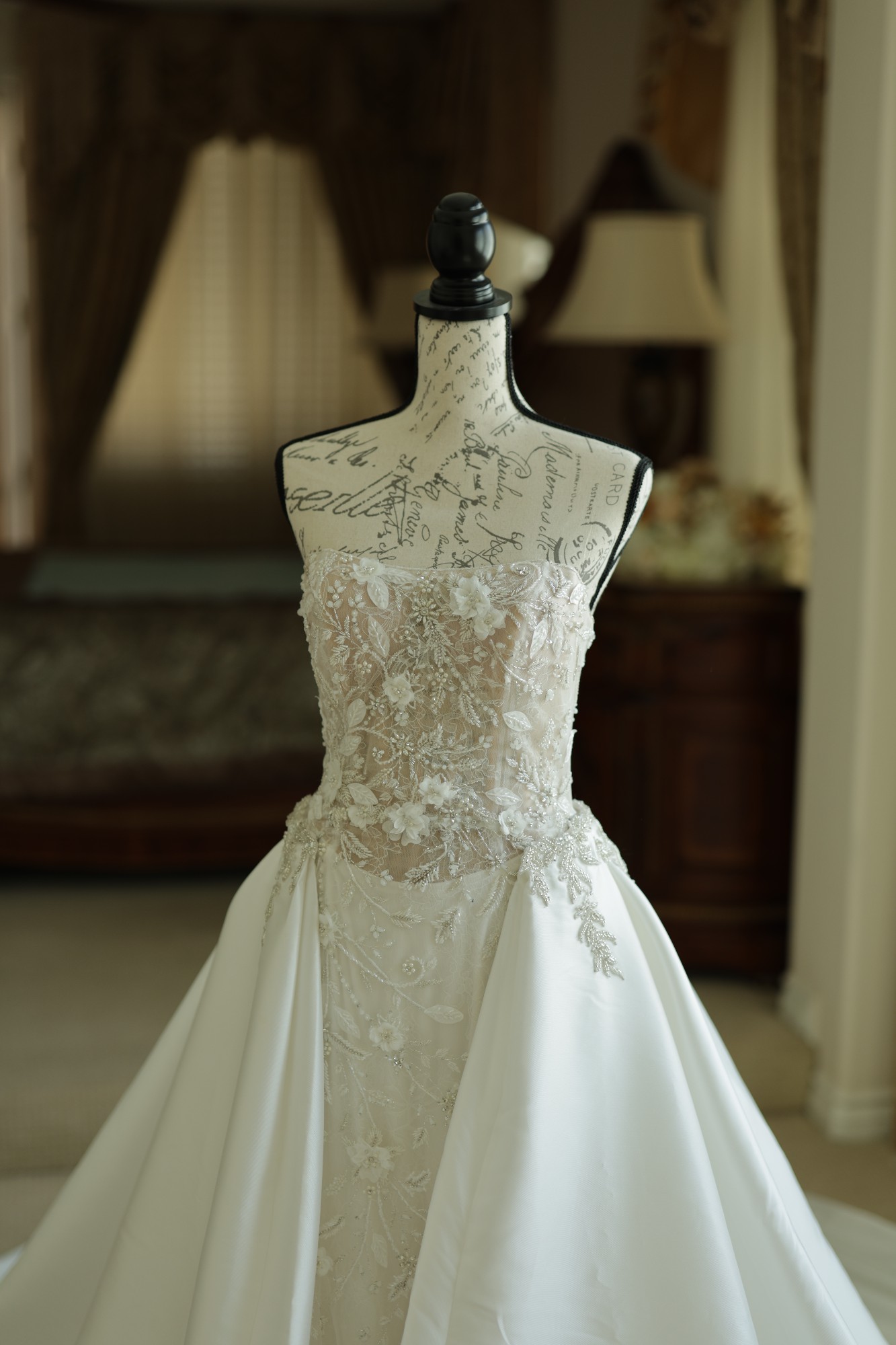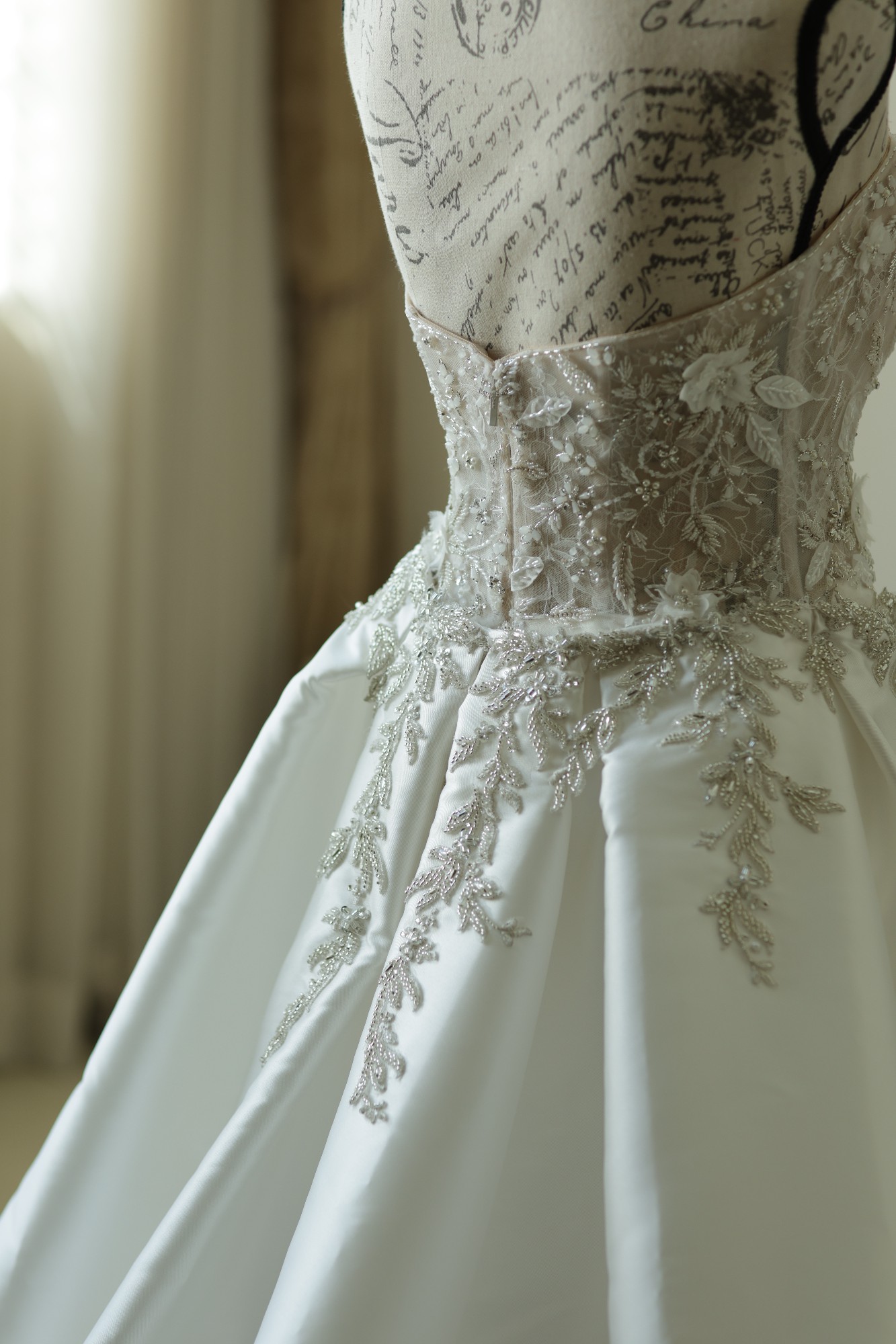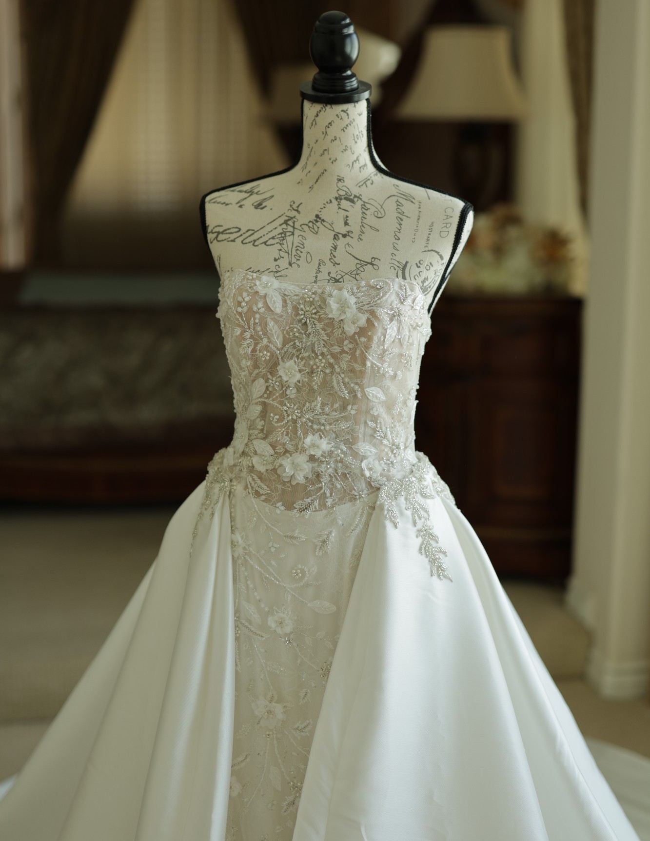 STYLE/GOWN NAME: Lisette This wedding dress features a Fit and Flare Gown and Strapless Straight Neckline with Stretch Lining, Tulle, Floral Lace Appliques, with Beading and Embroidery. However, the boning of the waste was elongated.