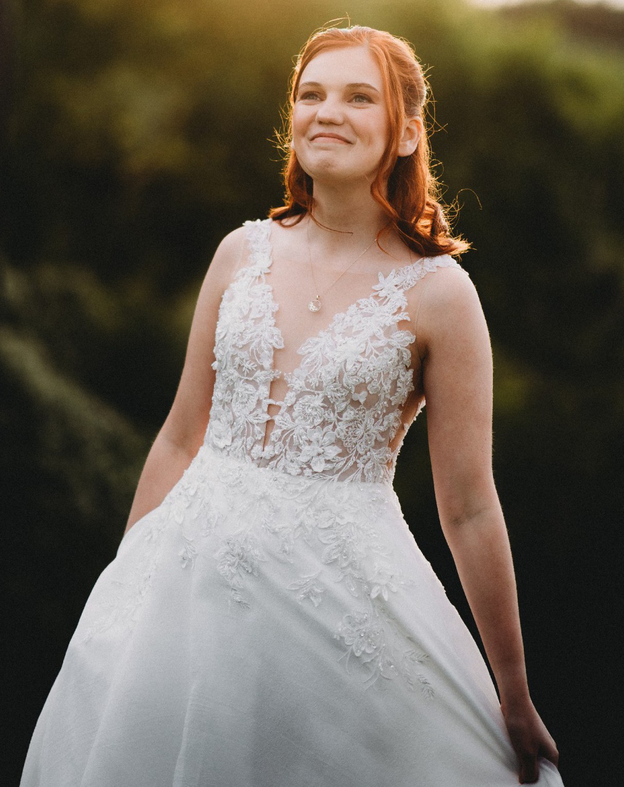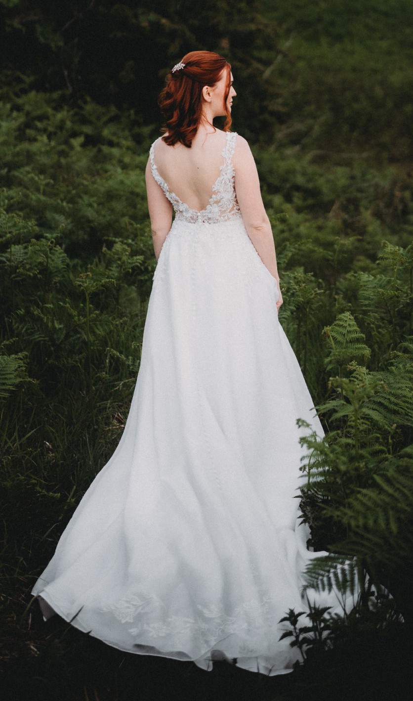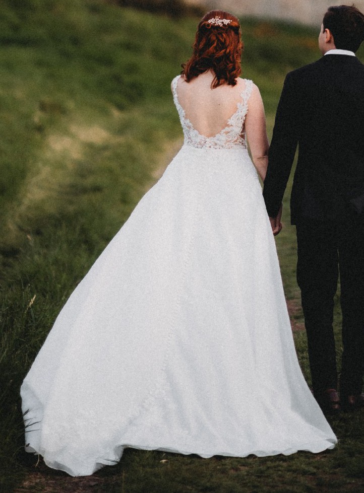 This Ivory/Ivory/Ivory/Latte dress has a sheer and plunging neckline and a deep V-back (almost backless). It has buttons that go all the way down the back (my favorite part), POCKETS, and lace & beading on the top that fade into the organza skirt. It has a chapel train with a bit of the lace and beading on it. The waistline is natural, and the dress is very flattering!