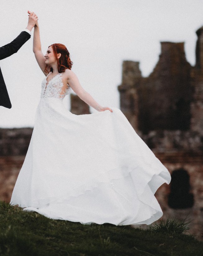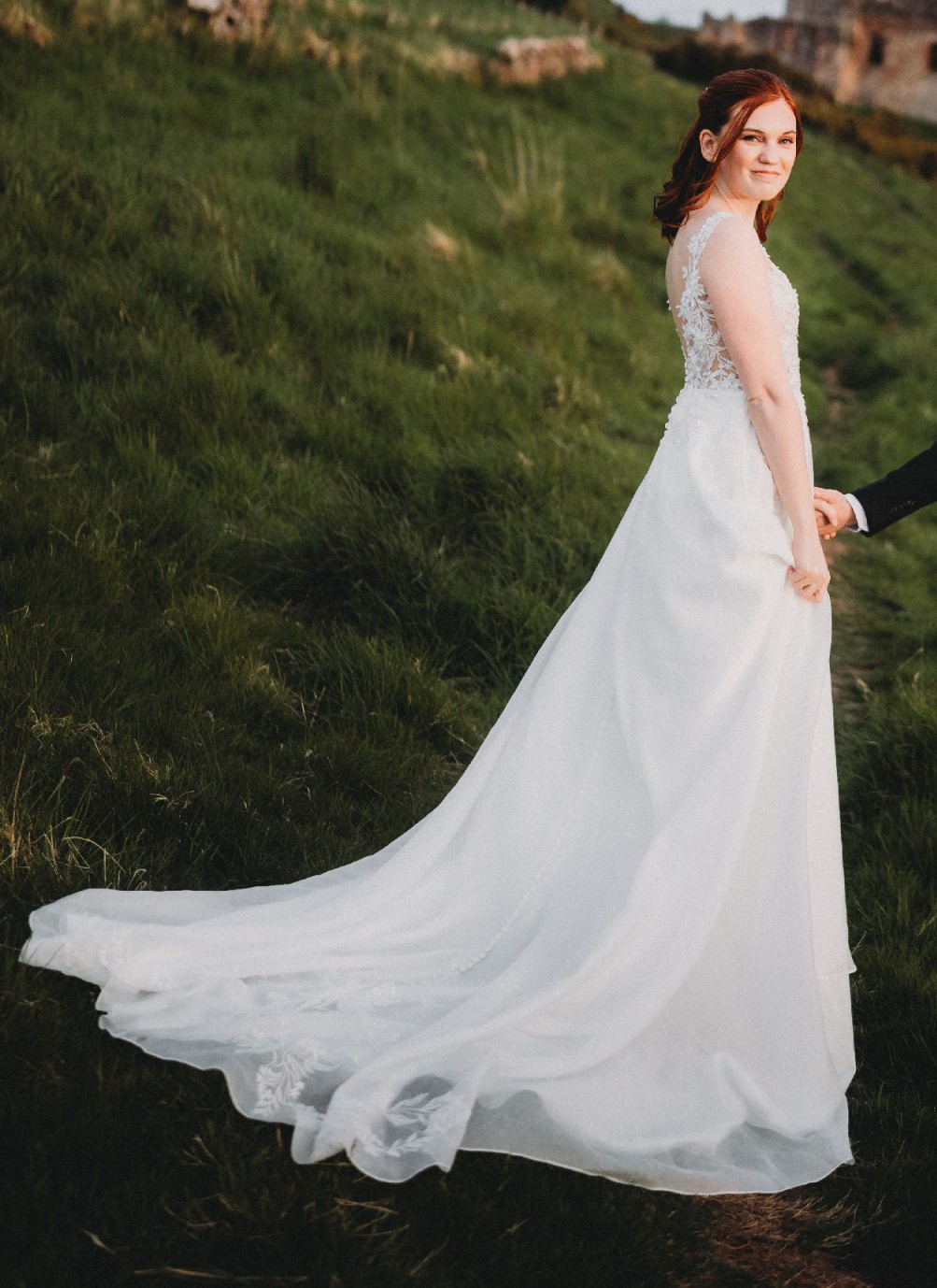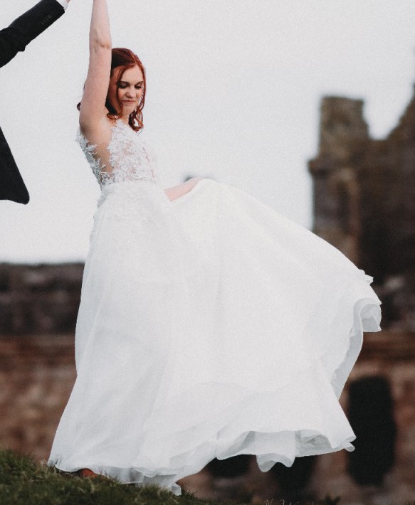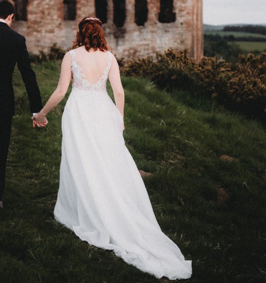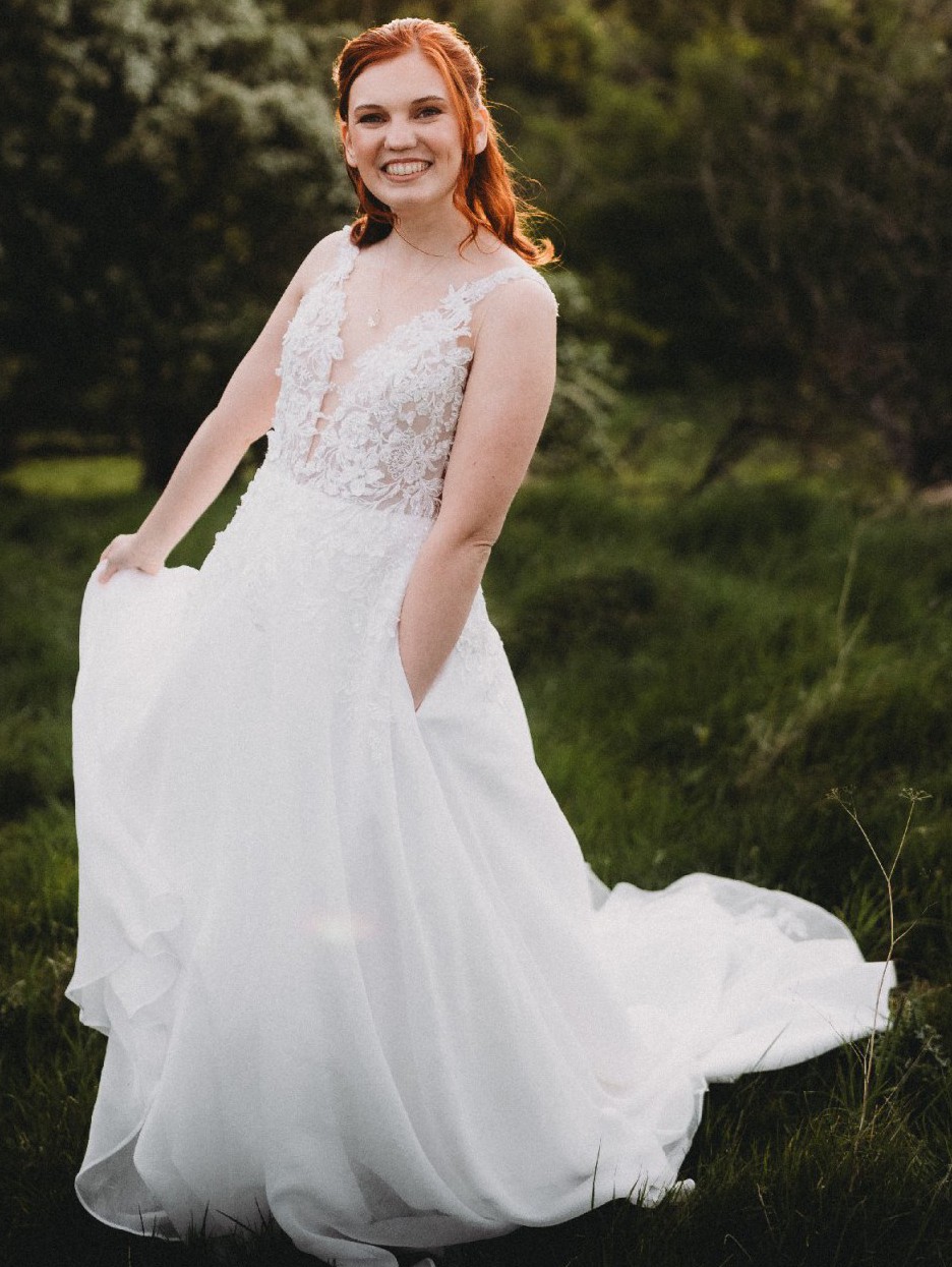 This Ivory/Ivory/Ivory/Latte dress has a sheer and plunging neckline and a deep V-back (almost backless). It has buttons that go all the way down the back (my favorite part), POCKETS, and lace & beading on the top that fade into the organza skirt. It has a chapel train with a bit of the lace and beading on it. The waistline is natural, and the dress is very flattering!