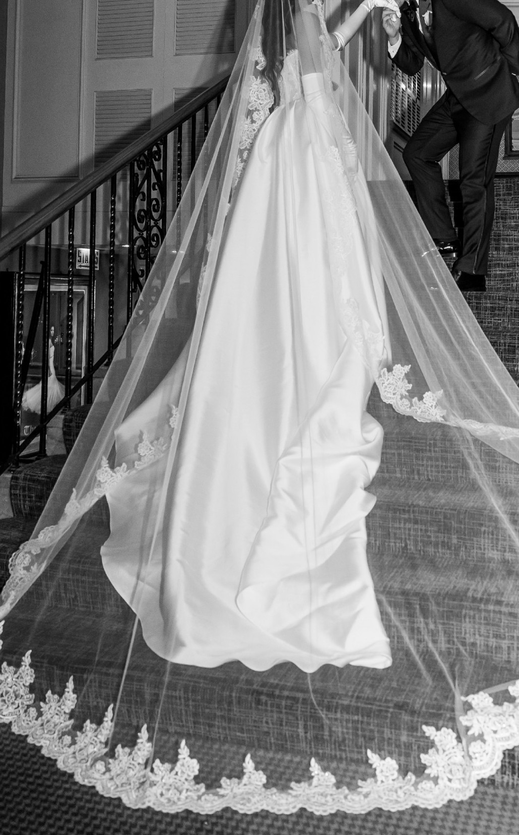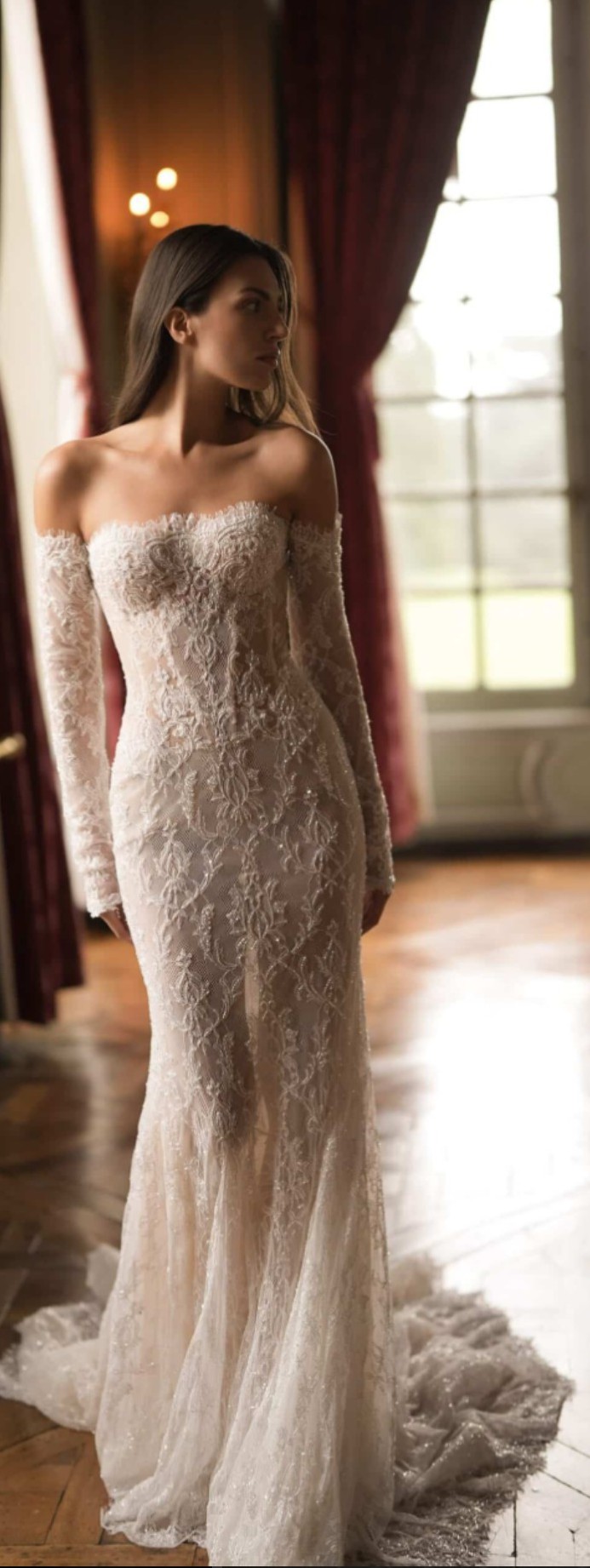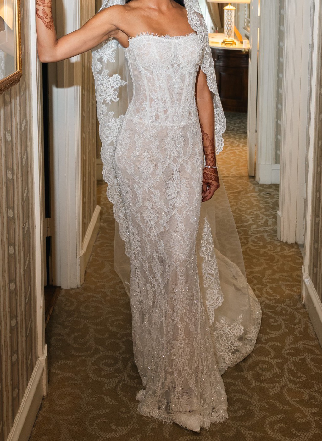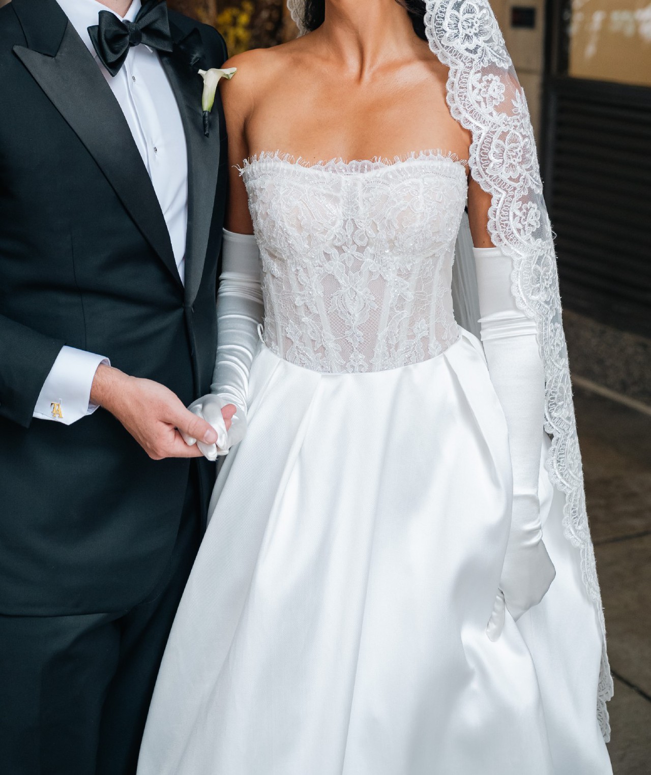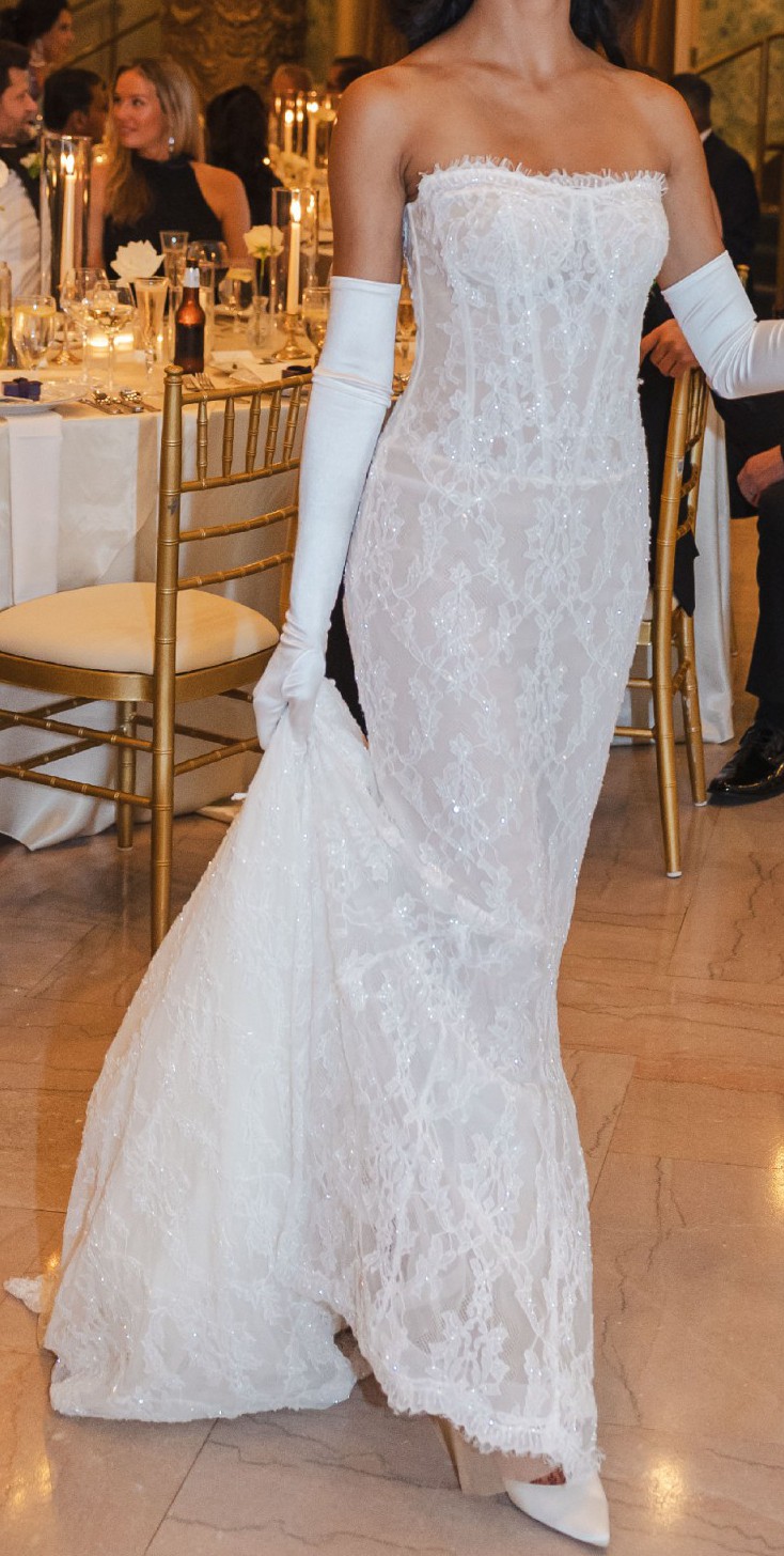 This is a Lee Petra F/W 2025 mermaid gown featuring a straight neckline with detachable off the shoulder sleeves. I did not wear the sleeves (but I have them for you) and opted to wear satin opera gloves with the look instead. I also had a custom overskirt created for the ceremony. I’m happy to sell these items altogether or separately!