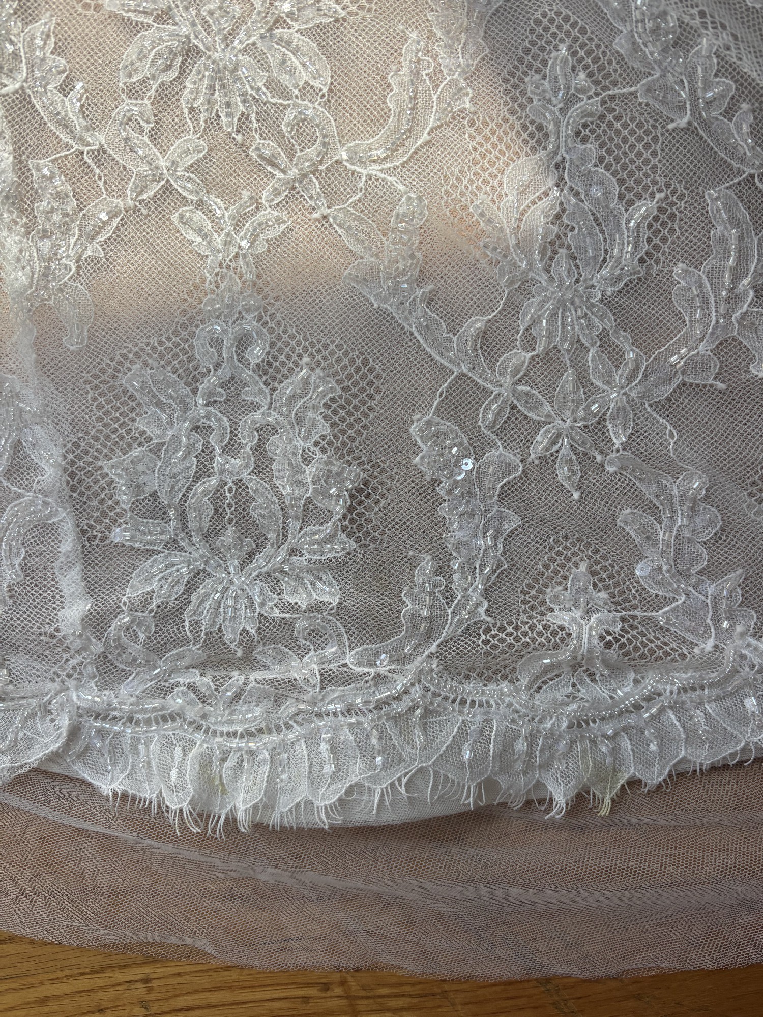 I sent this dress to a professional dry cleaner but they recommended to NOT dry clean because it would affect the delicate eyelash lace at the neckline. The listing price reflects normal wear (I wore this gown once, for my wedding night). There is a small tear at the very bottom and some minor stains near the hem that would be very tough to see unless you’re specifically looking for them. In total I spent almost $15k on this gown, overskirt, gloves and alterations.