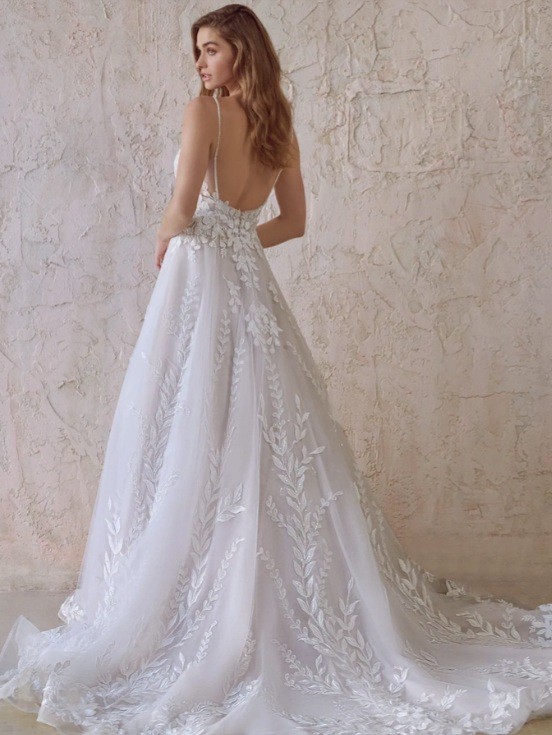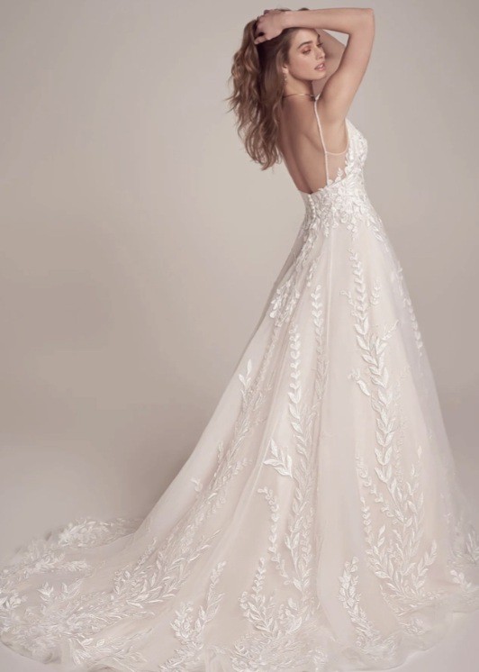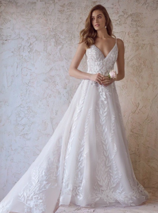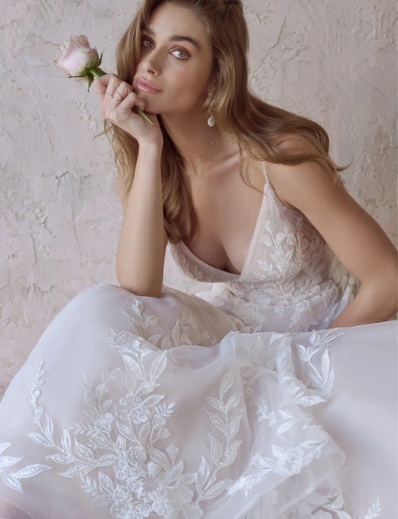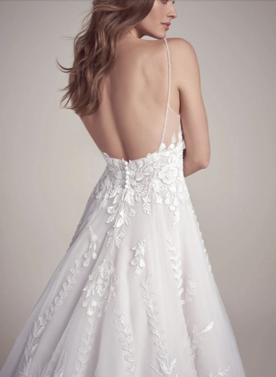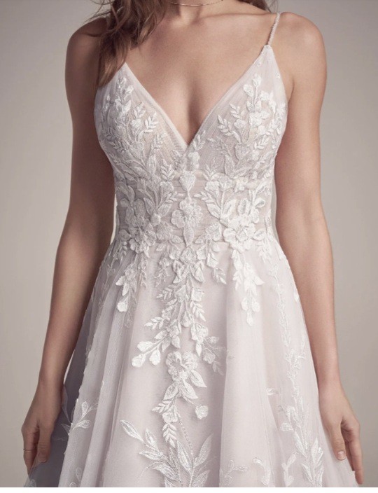 It's known for its romantic and ethereal style, featuring intricate lacework, flowing fabrics, and delicate embellishments. The dress has a sheer lace bodice lined with organza, a V-neckline, and beaded spaghetti straps. It also has a zipper with covered button closure. This dress is Ivory over Blush illusion.