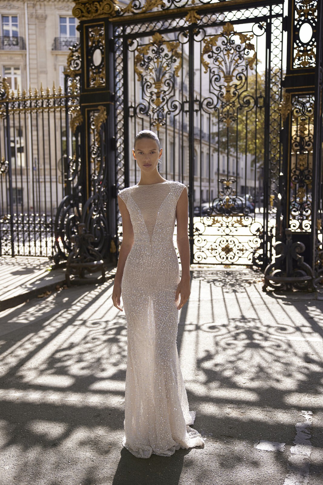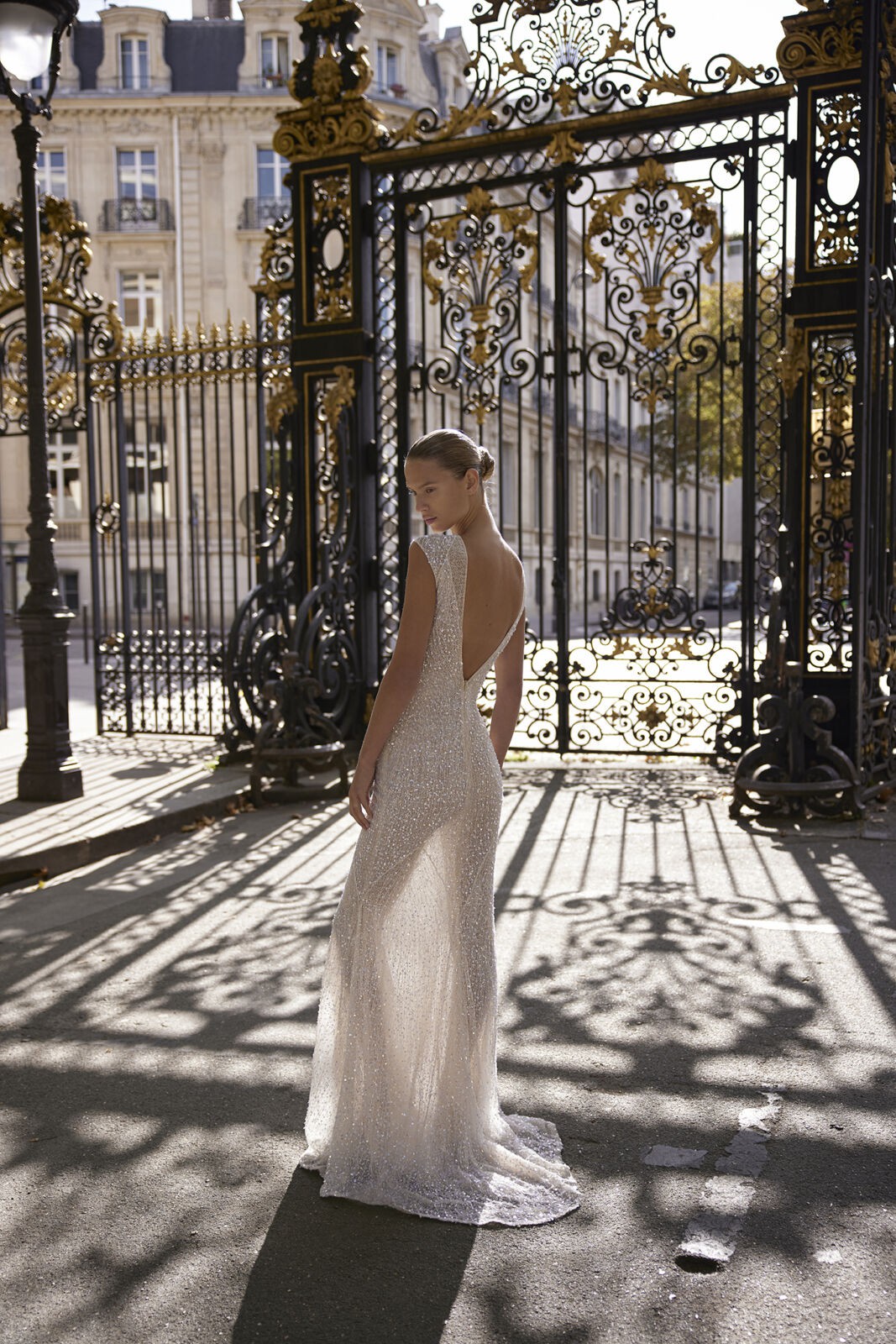 A sheer feminine, sexy and extremely flattering dress, with hand-embroidered beaded fabric, sequins and pearl accents, and a deep plunging back. Flowy, Seductive, and Light