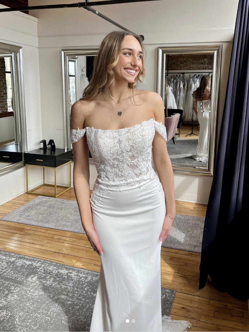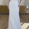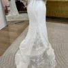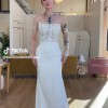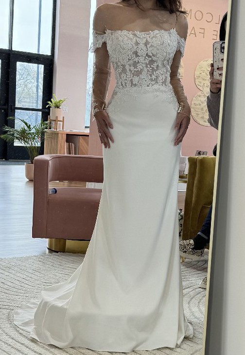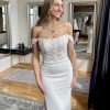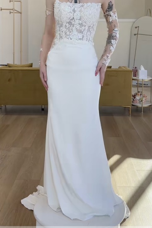 This stunning fitted wedding gown in a soft ivory tone blends modern elegance with romantic detail. Designed with a flattering, slightly mermaid silhouette, the dress features a clean strapless neckline and comes with detachable off-the-shoulder sleeves for added versatility.