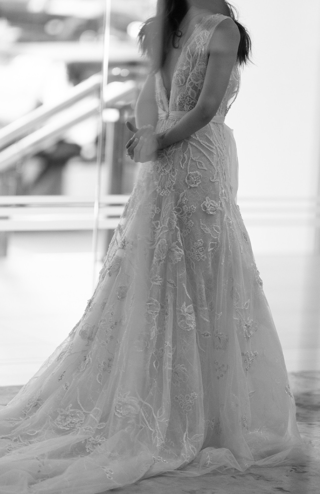 The gown has been expertly altered to better contour the body, enhancing its naturally flattering shape. The side arms were also adjusted for a wider opening and a slimmer profile when worn, ensuring both comfort and elegance throughout the day.