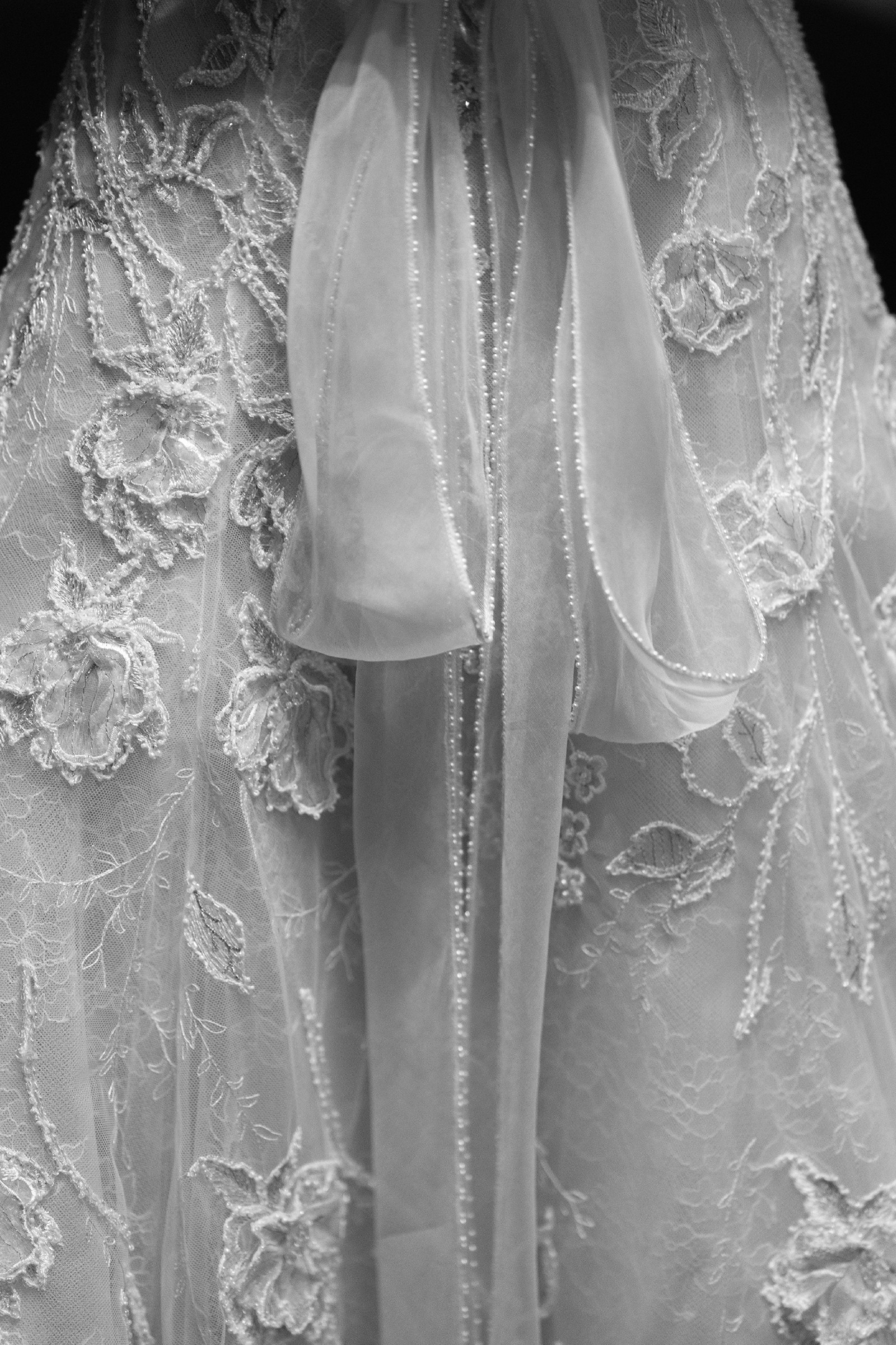 - Meticulous handwork: 3D floral appliqués, delicate beading, and intricate embroidery—a couture creation in every sense
