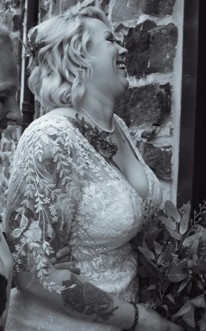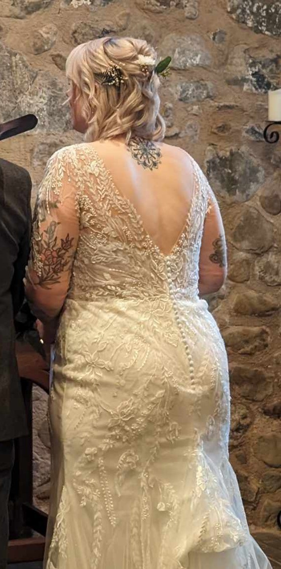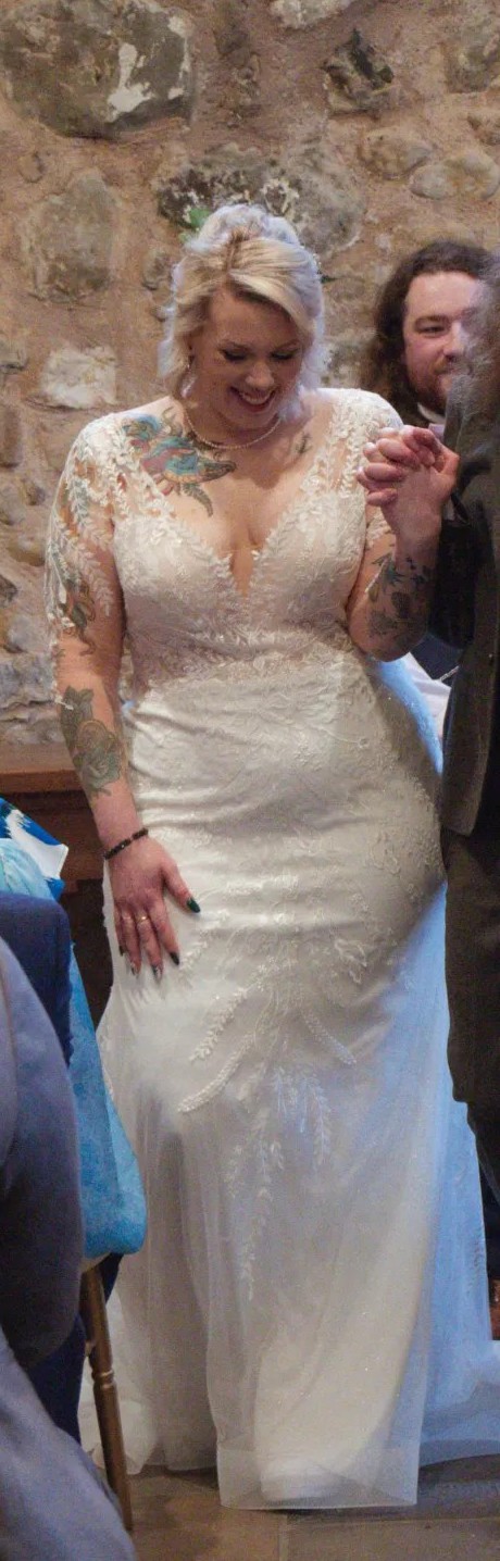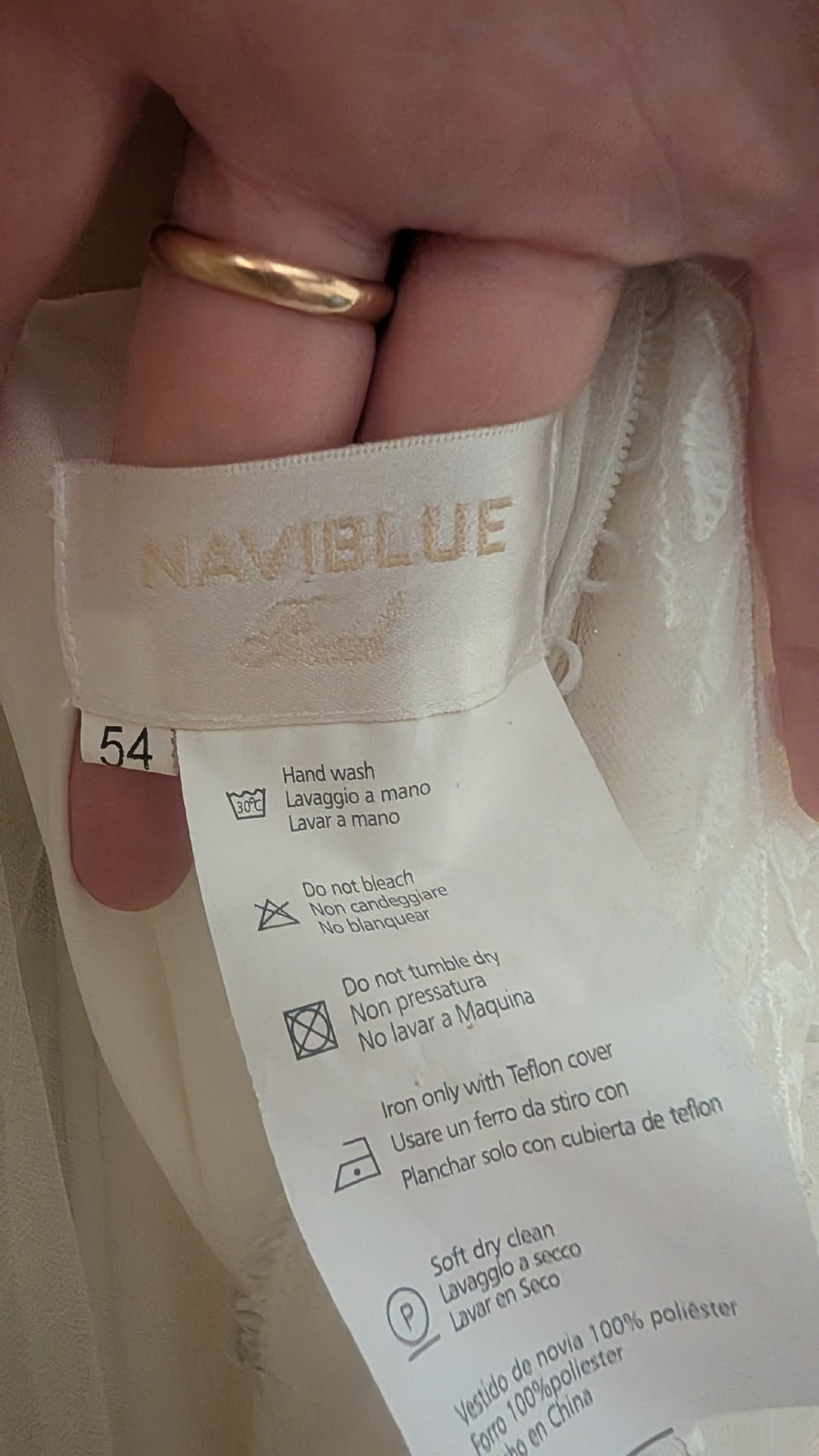 This exquisite Naviblue dress, Henny 22019, made my wedding day absolutely magical. The trumpet silhouette hugged my curves perfectly, giving me both elegance and confidence as I walked down the aisle. The V-neckline beautifully frames the neckline and creates a stunning focal point, complemented by delicate long sleeves that add an air of sophistication.