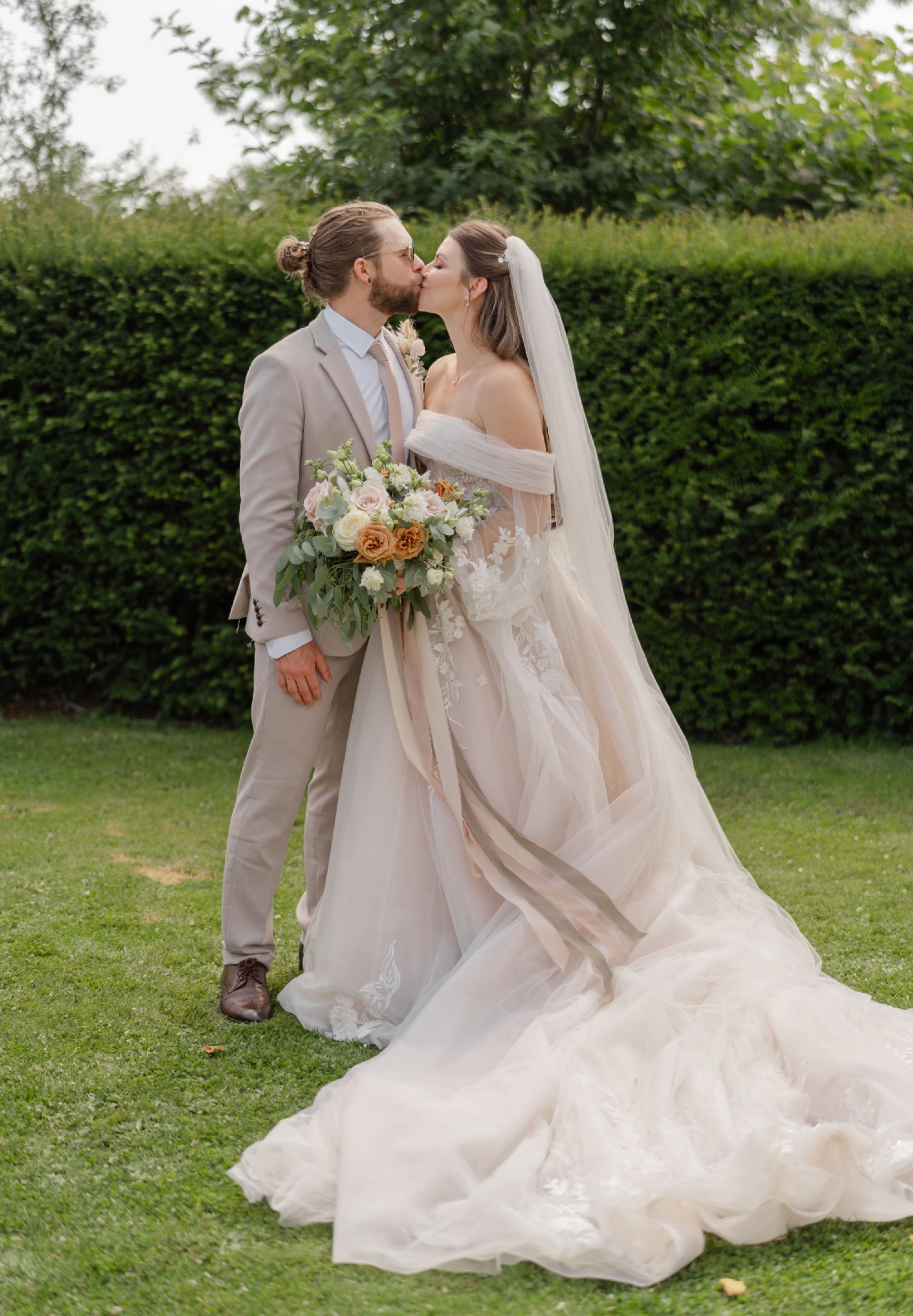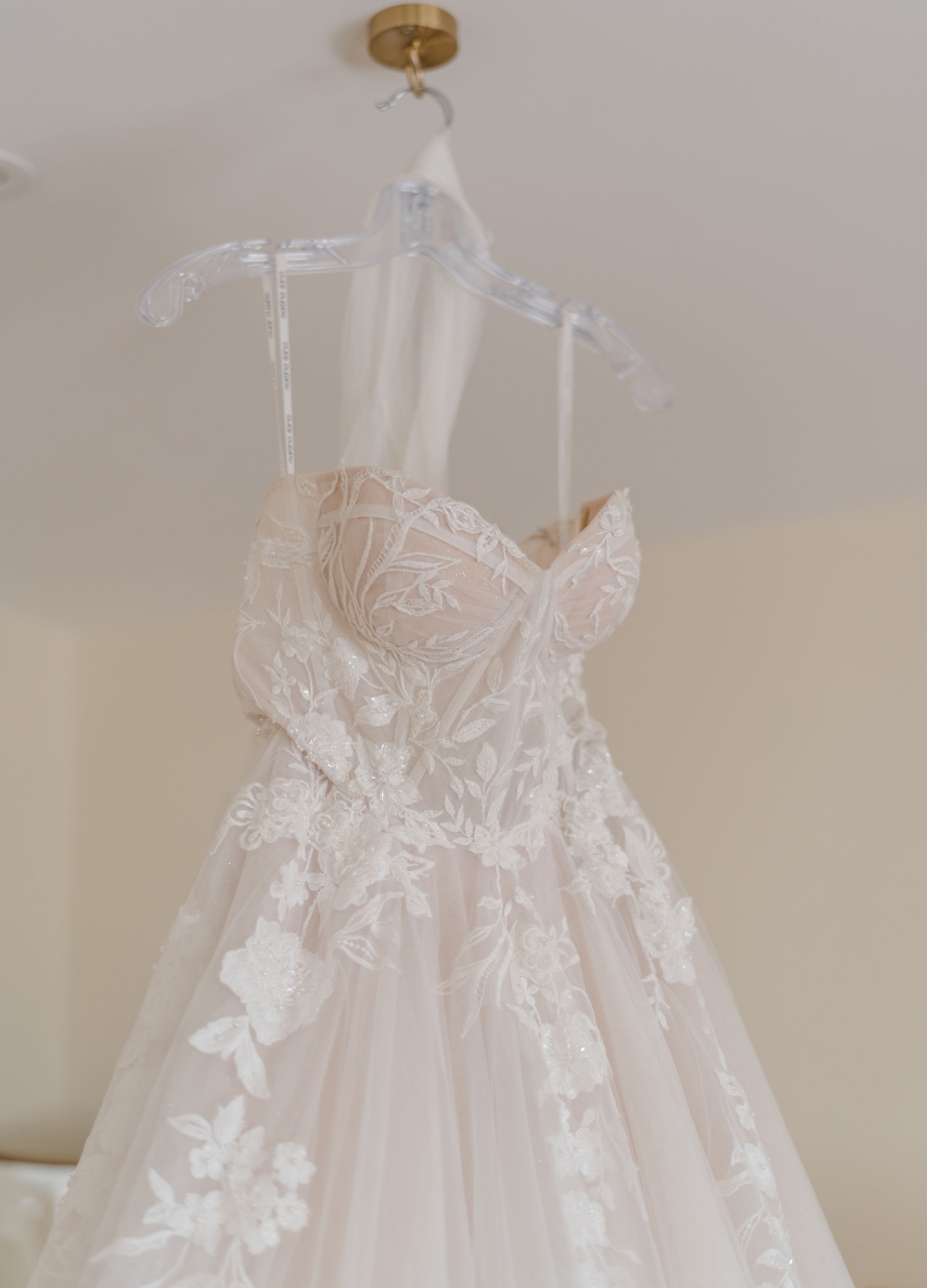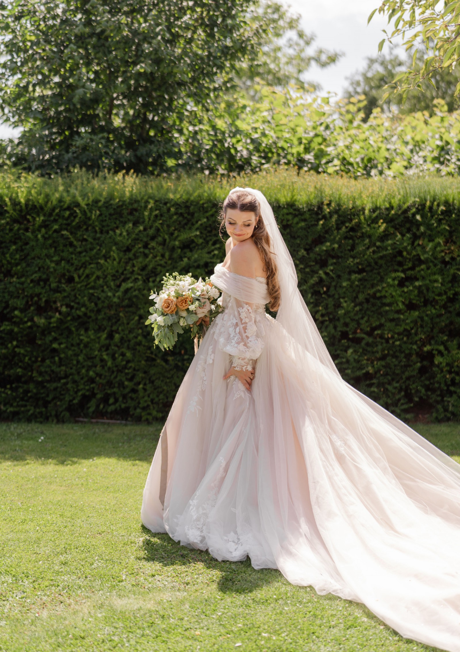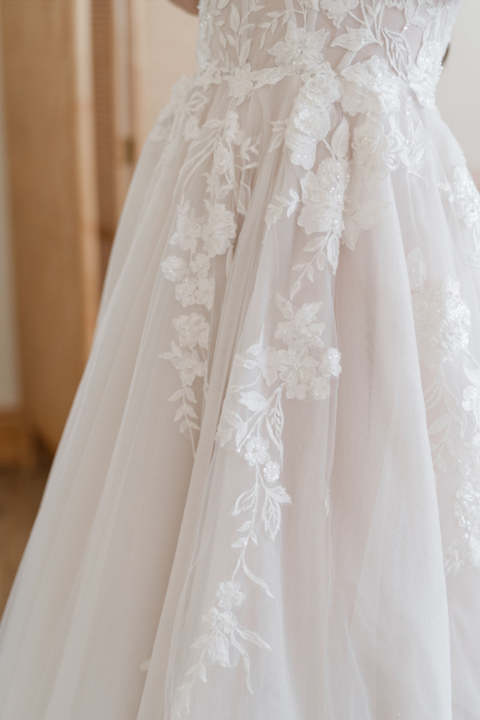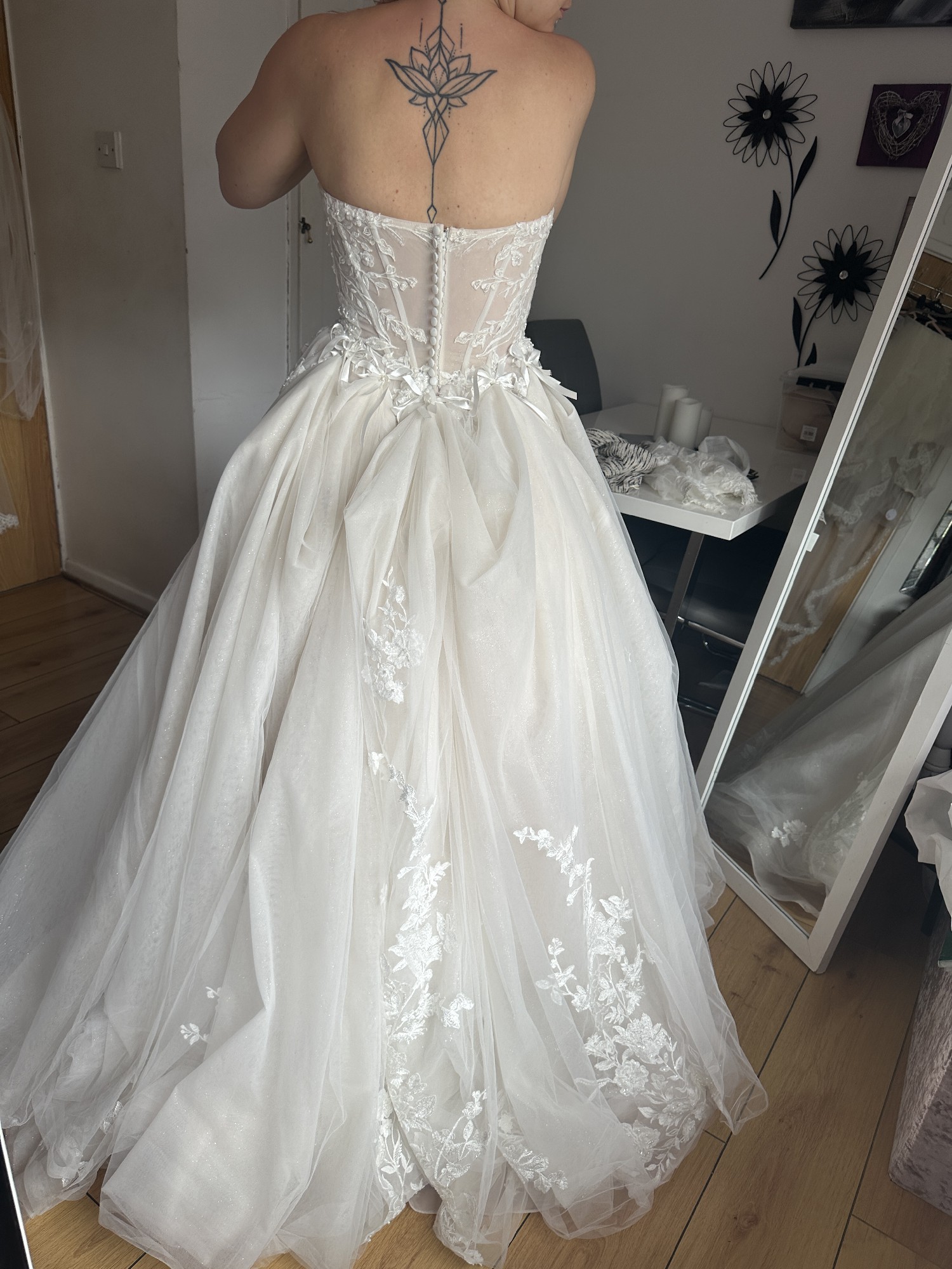 This gown features approximately 8 layers of beautiful tulle and removable sleeves creating a dramatic and elegant look. The hip padding has been removed (as seen in the last photo), but it can easily be added back in. It’s been altered to fit my height – I’m 173 cm and wore 3–4 cm heels. The train has also been altered so it can be pinned up for easier movement. It has also been professionally cleaned.